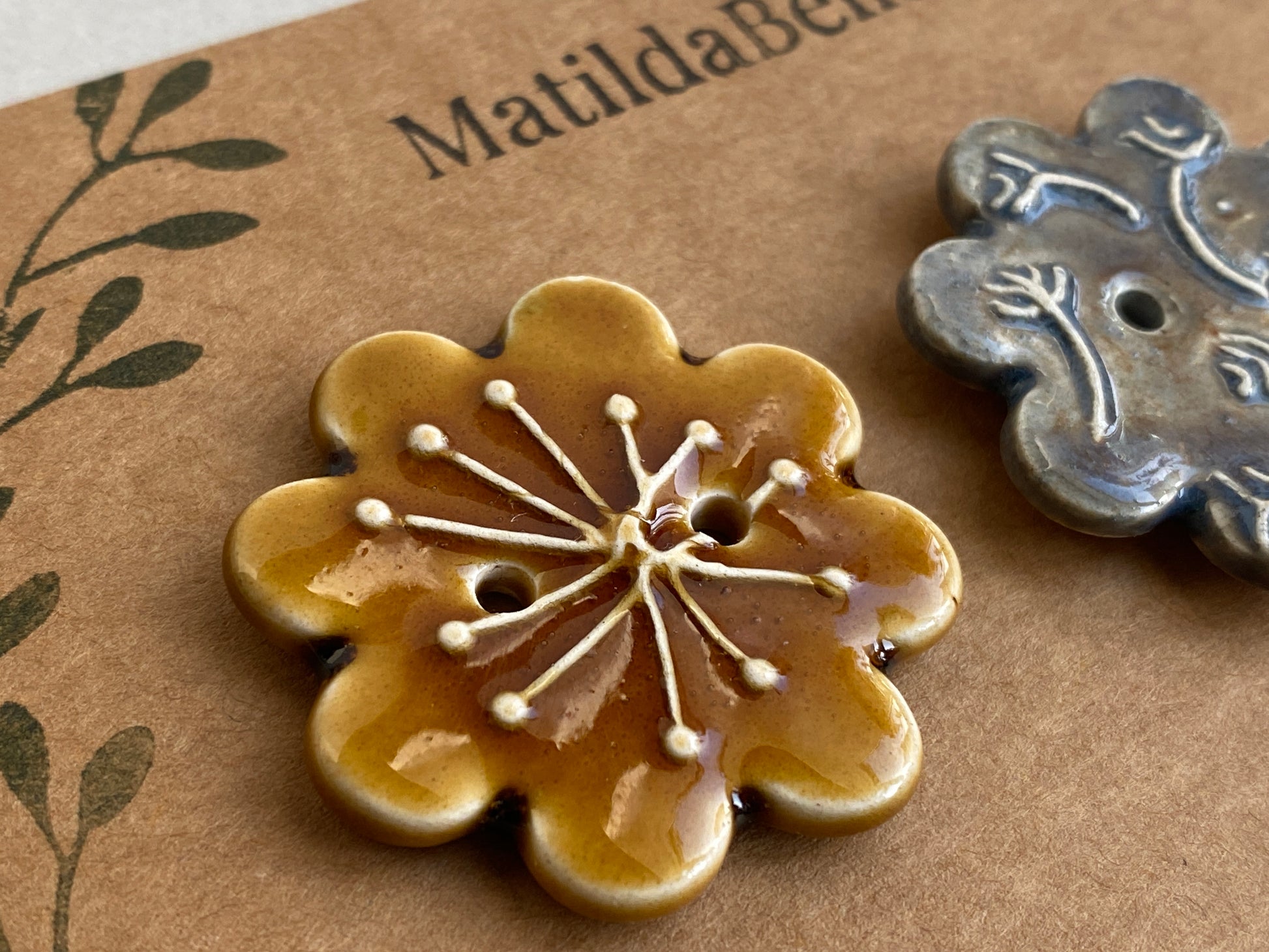 These large Flower buttons measure approximately 37mm x 3mm, and are glazed in the richest Honey Heather, Red and Green. The front displays the intricate flower carvings, while the unglazed reverse lets you feel the clay's texture, complete with my signature maker's mark.