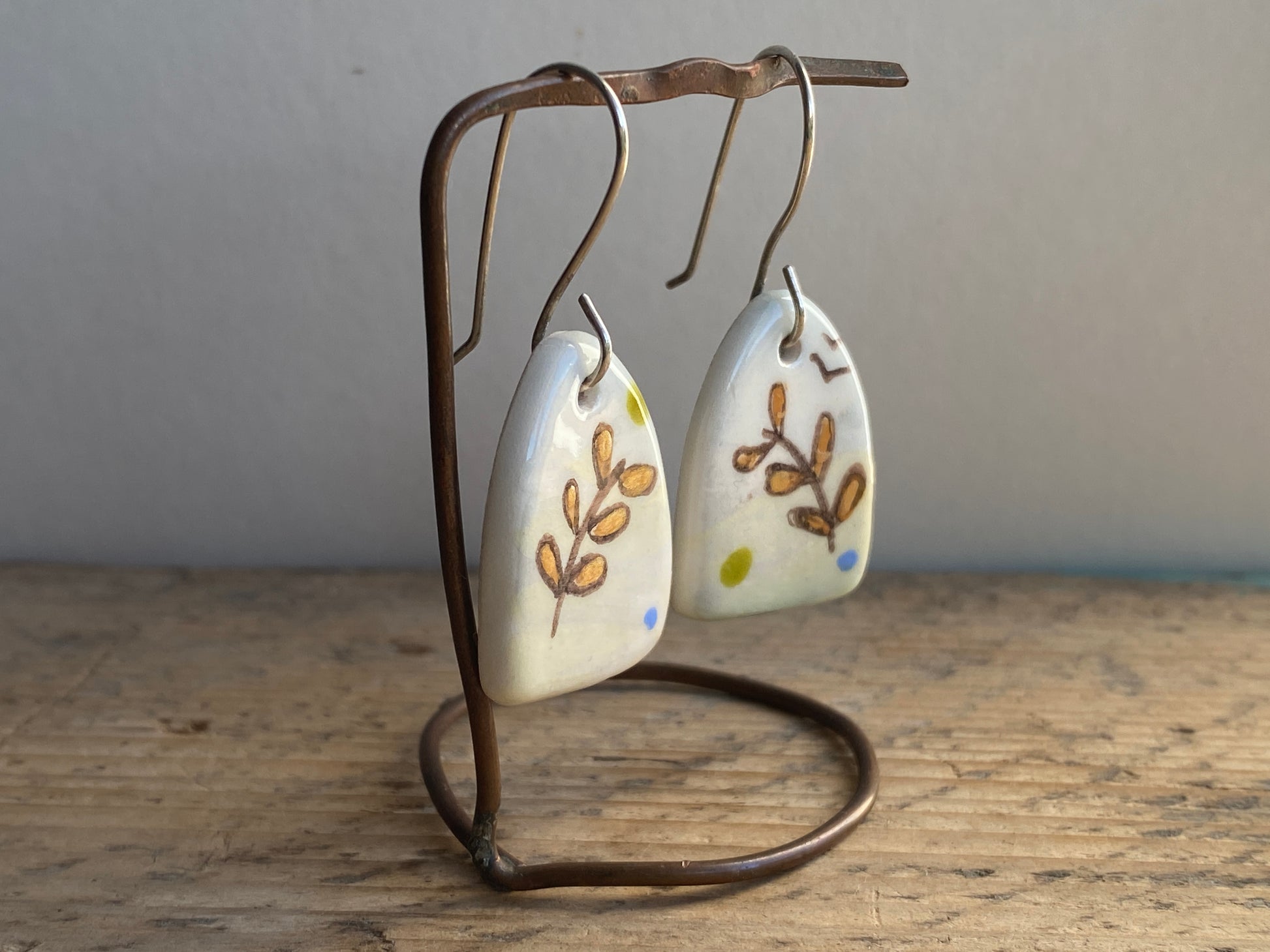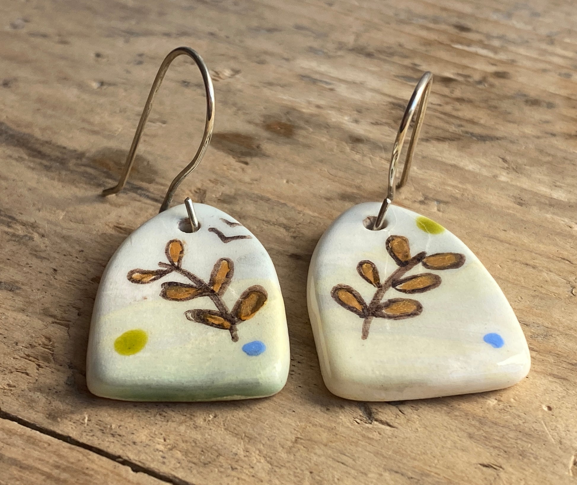 Botanical Handmade Ceramic Earrings, these beautiful dangly earrings have been hand formed from Earthenware clay. Charming botanical illustrations are meticulously hand-painted using a nature inspired palette with a little flourish of gold.