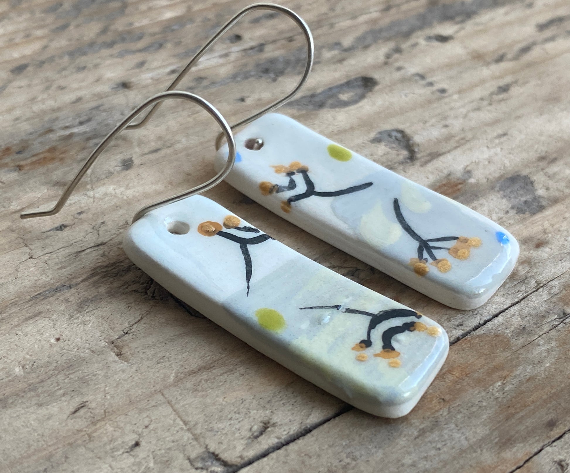 Botanical Handmade Ceramic Earrings, these beautiful dangly earrings have been hand formed from Earthenware clay. Charming Seed Head botanical illustrations are meticulously hand-painted using a nature inspired palette with a little flourish of Gold.