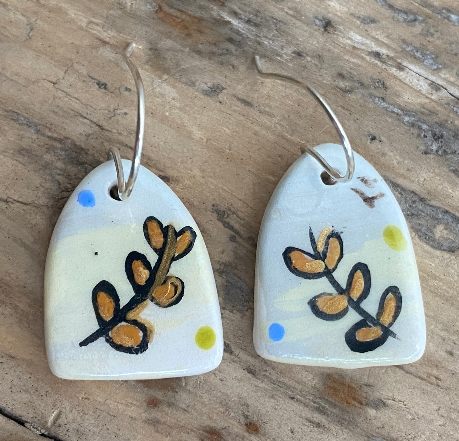 Botanical Handmade Ceramic Earrings, these beautiful dangly earrings have been hand formed from Earthenware clay. Charming Seed Head botanical illustrations are meticulously hand-painted using a nature inspired palette with a little flourish of Gold.