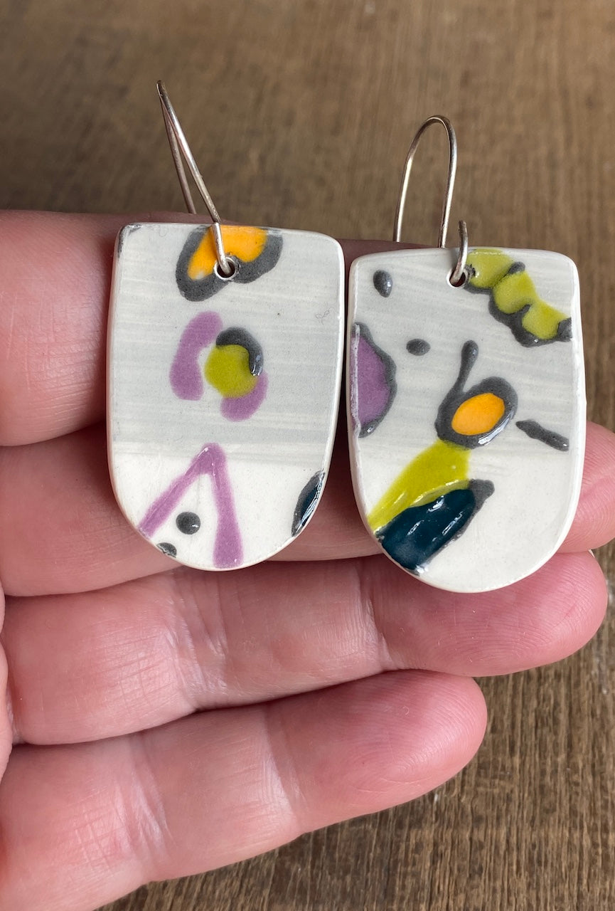Elevate your style with these beautiful dangly earrings adorned with charming botanical illustrations, meticulously hand-painted using vibrant underglazes. The stunning colour palette includes shades of grey complemented by highlights of Orange, lim and purple, ensuring each pair is a unique masterpiece.