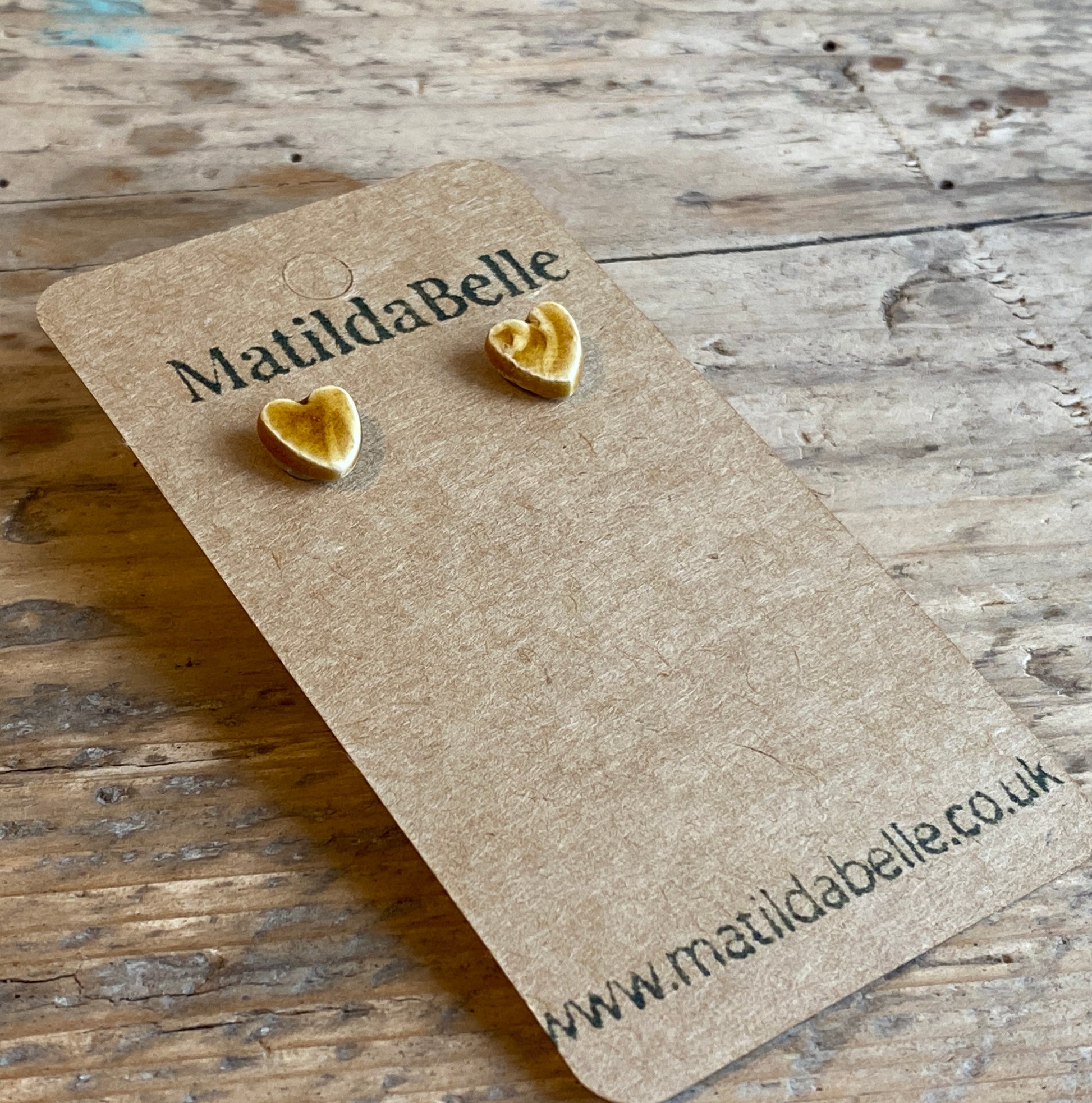 These tiny handmade heart stud earrings are hand formed from earthenware clay. The clay has been imprinted with original botanical carvings which peaks through the gorgeous glazes.