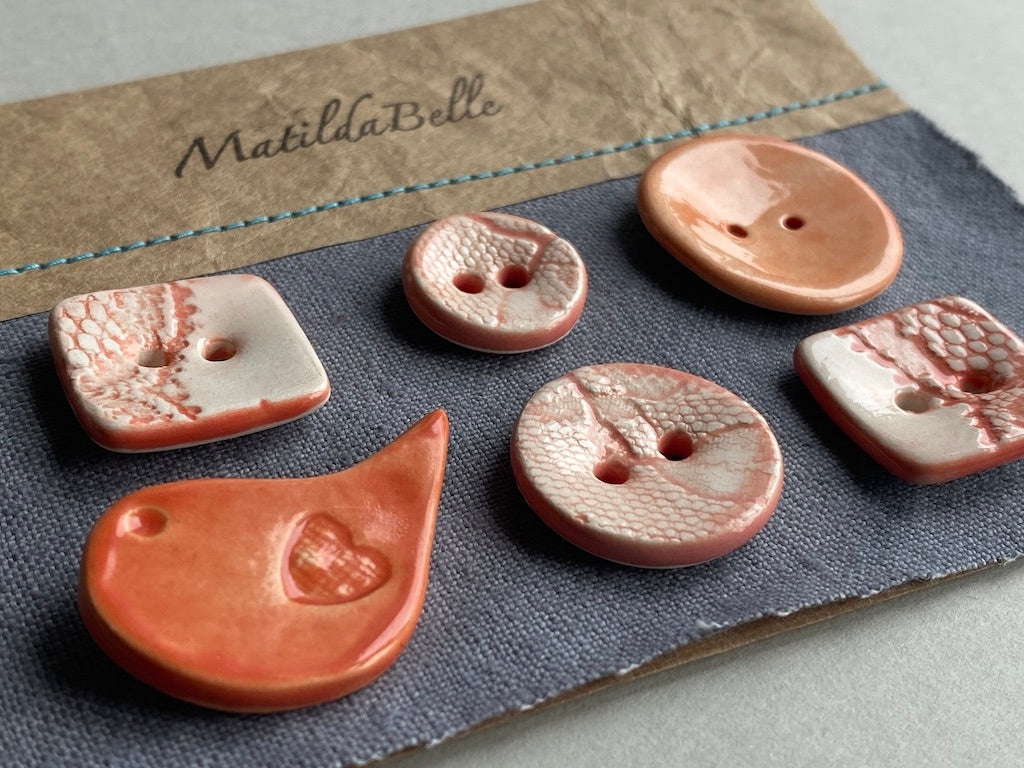 Delightful set of Six handmade ceramic buttons, each one a unique treasure in itself. Crafted from Earthenware Clay, these buttons are lovingly shaped and adorned with charming details like vintage lace and a cute bird. Fired twice in a kiln, they boast a smooth, glazed surface in a soothing pastel palette of Orange, while the back reveals the maker's mark for that extra touch of authenticity.