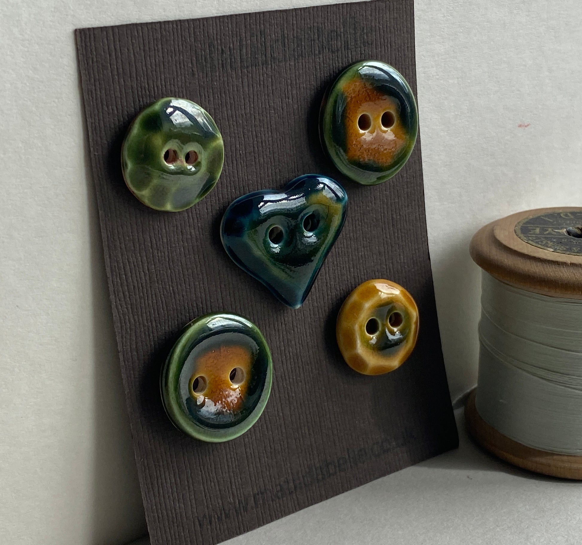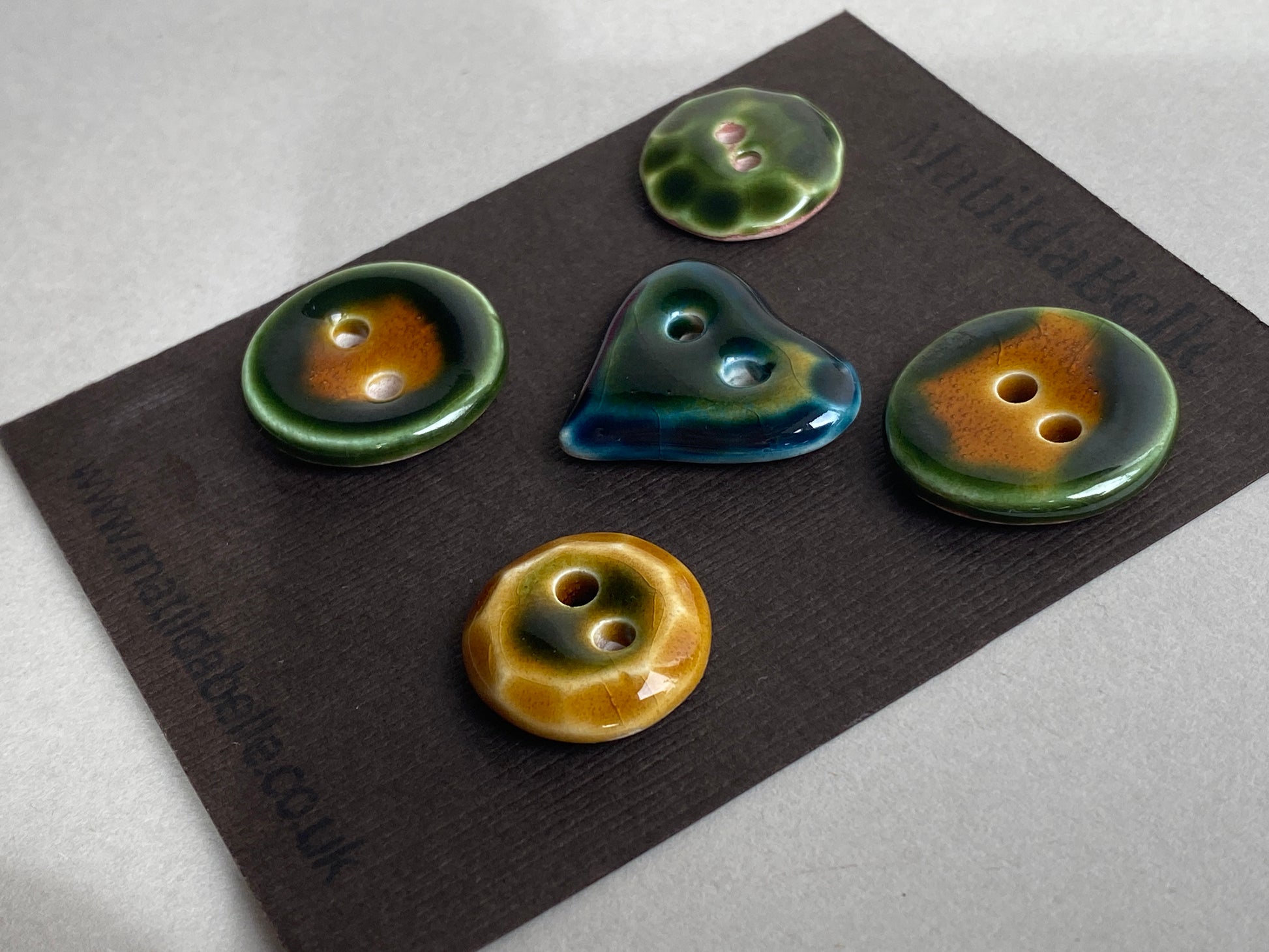 Introducing a delightful set of five handmade ceramic buttons, each one a unique treasure in itself. Crafted with care from Earthenware Clay and Fired twice in a kiln. They boast a smooth, glazed surface in rich jewel colours of, yellow, green ,petrol blue and rich honey while the back reveals the maker's mark for that extra touch of authenticity.