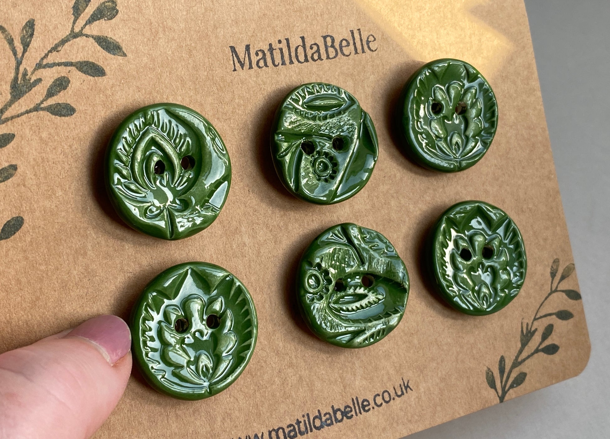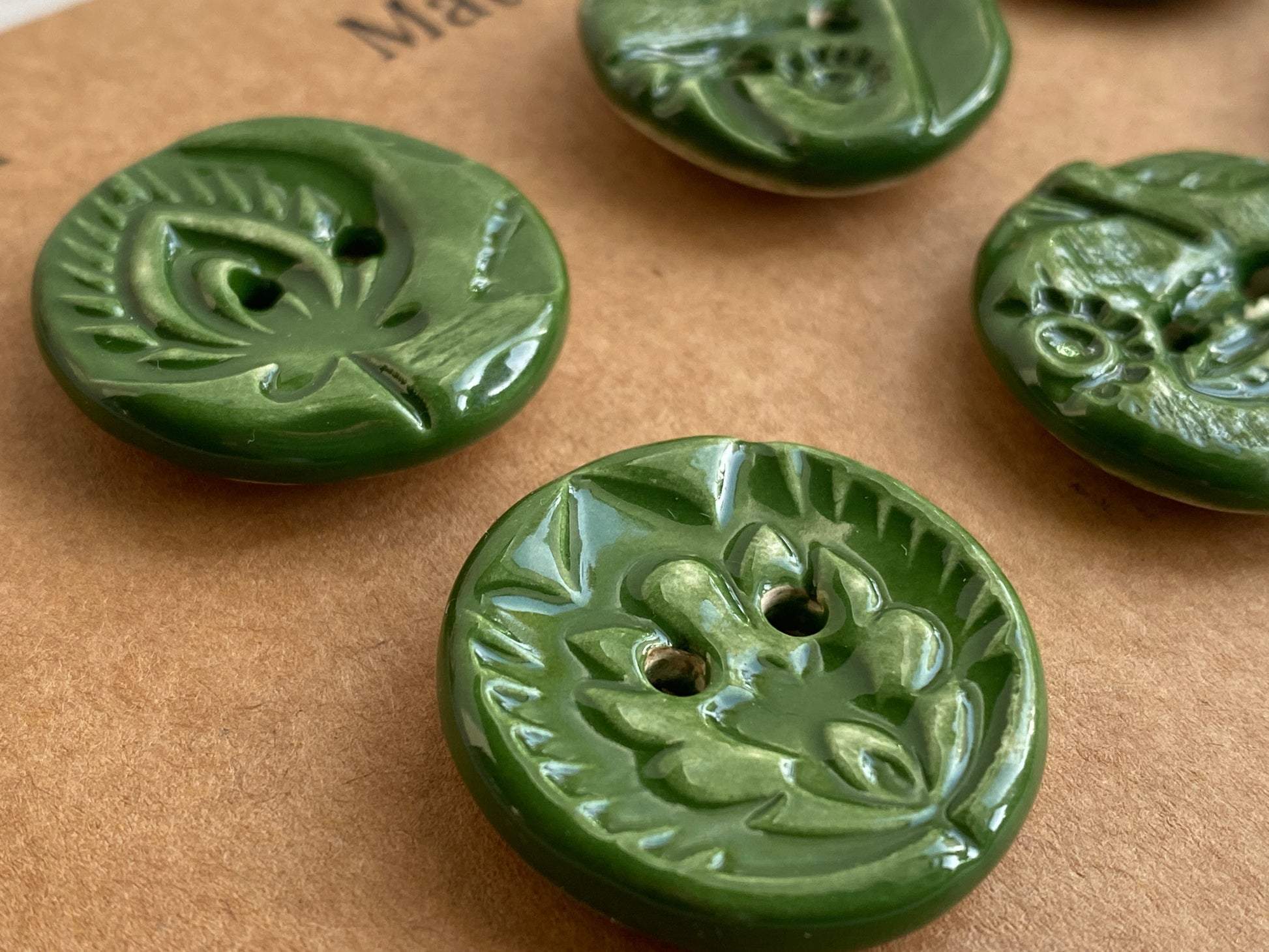 Set of 6 round Botanical Clay Buttons - 28mm - Glazed in Rich Forest Green