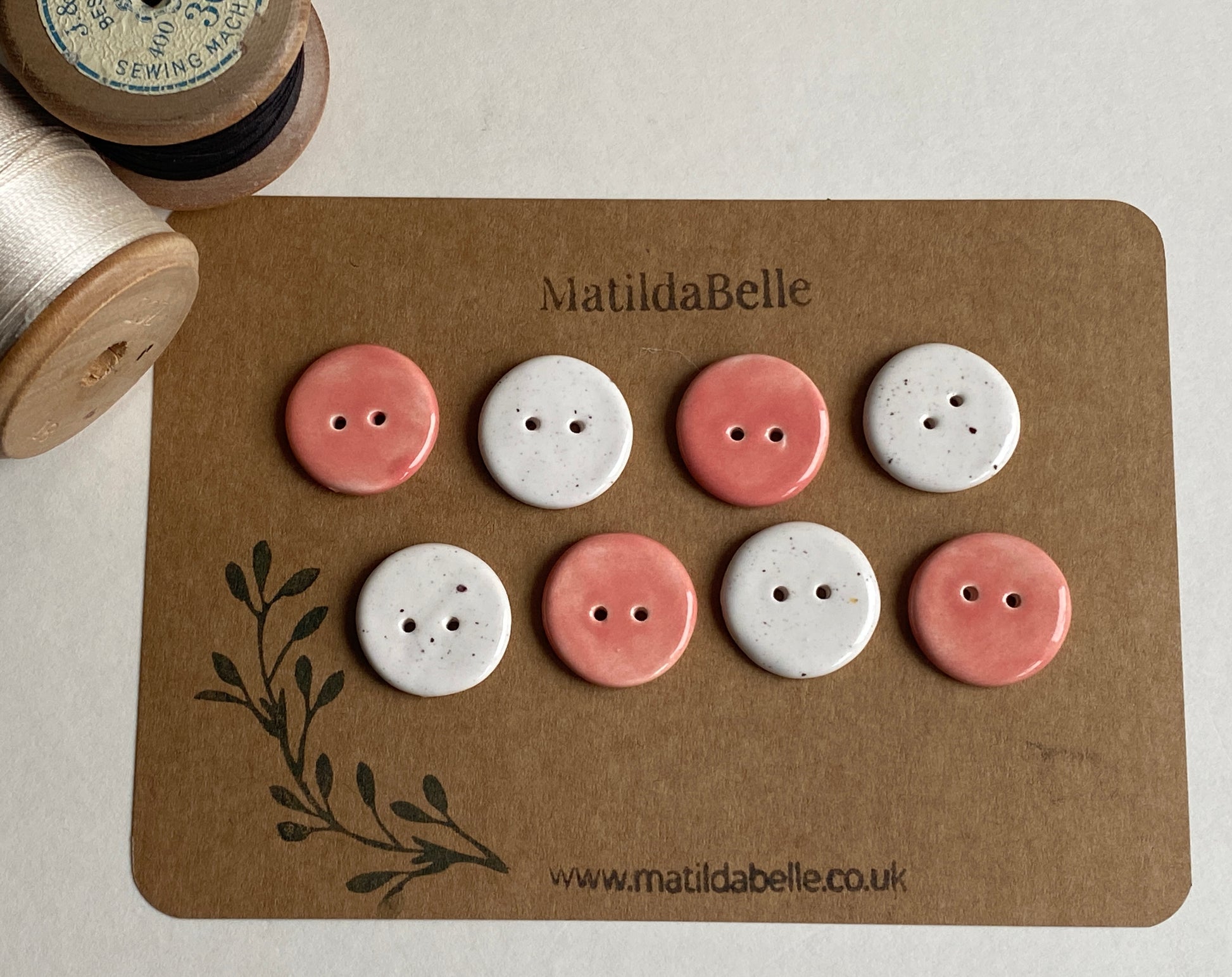 This gorgeous mixed colour set of Eight handmade ceramic round buttons have been glazed a fabulous candy pink and contrasting speckled white.