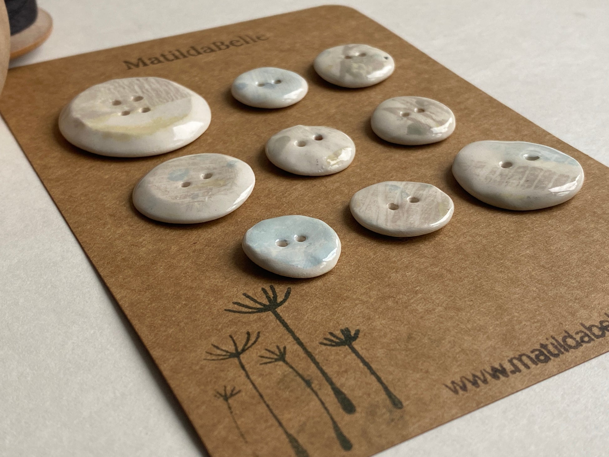 These buttons have been printed using coloured slips of mushroom with a hint of soft blue. They have a beautiful coastal vibe and would perfect partnered with Linen and natural yarns. Handcrafted with care, they showcase the natural variations of the clay, making each button truly unique.