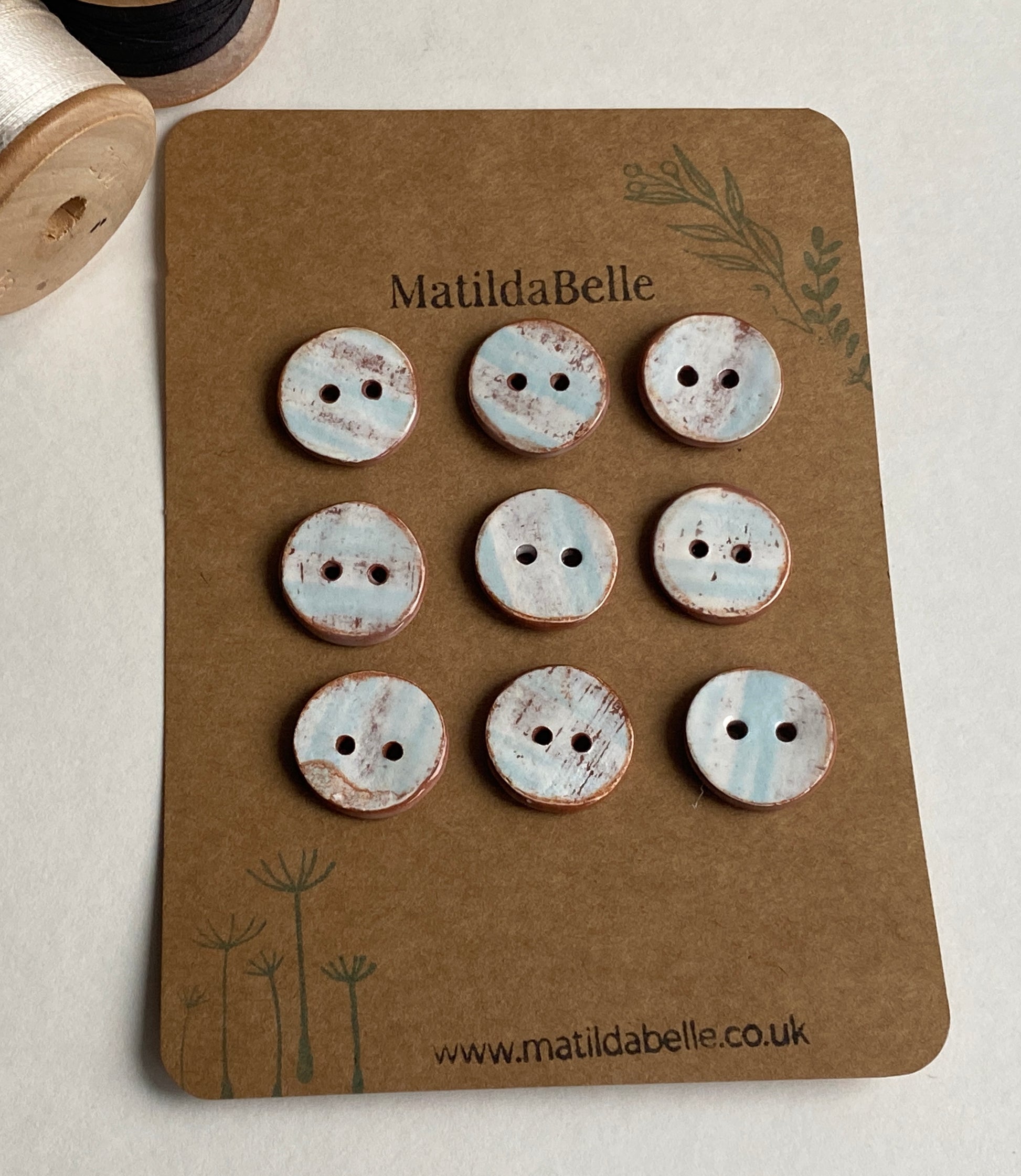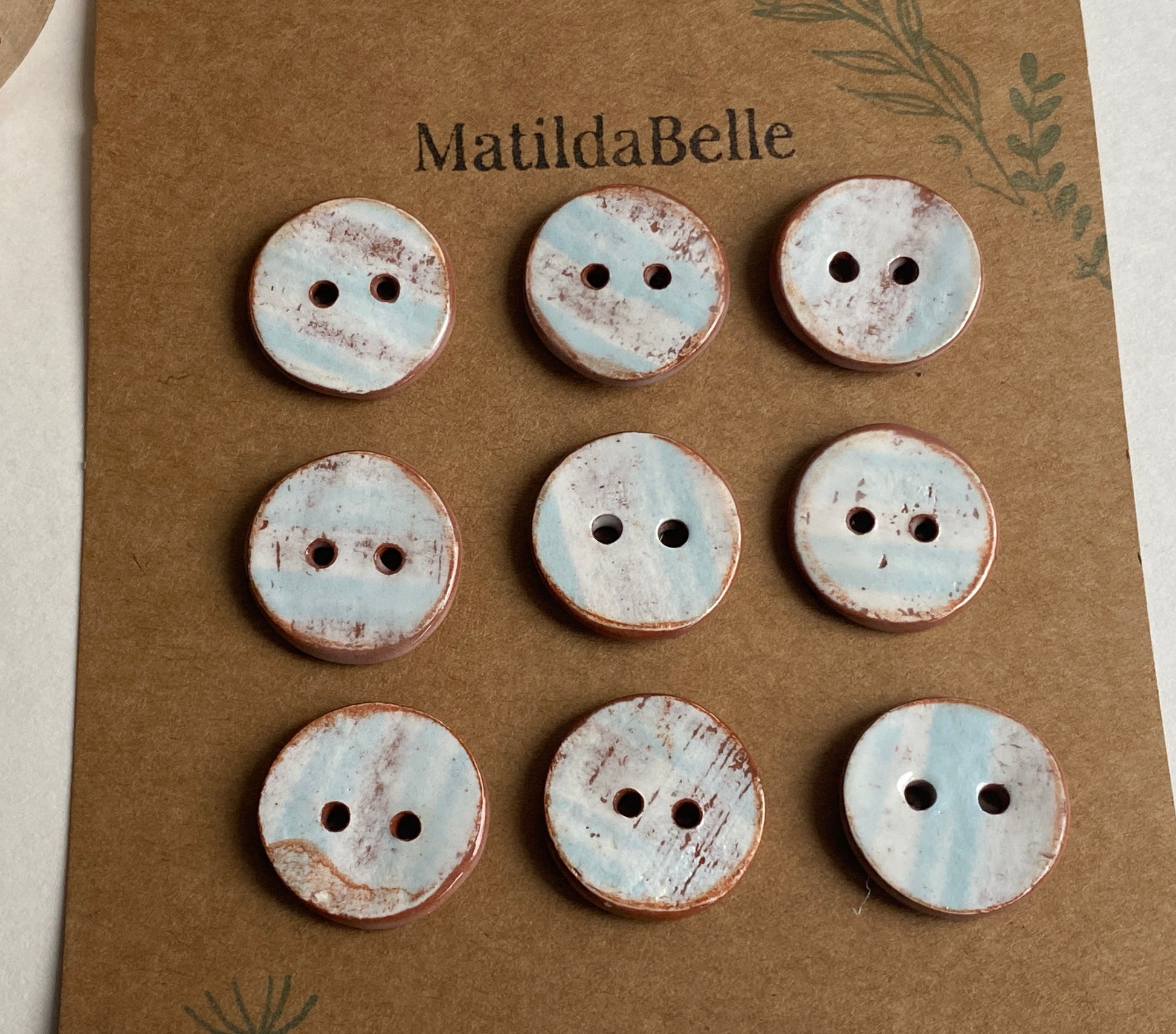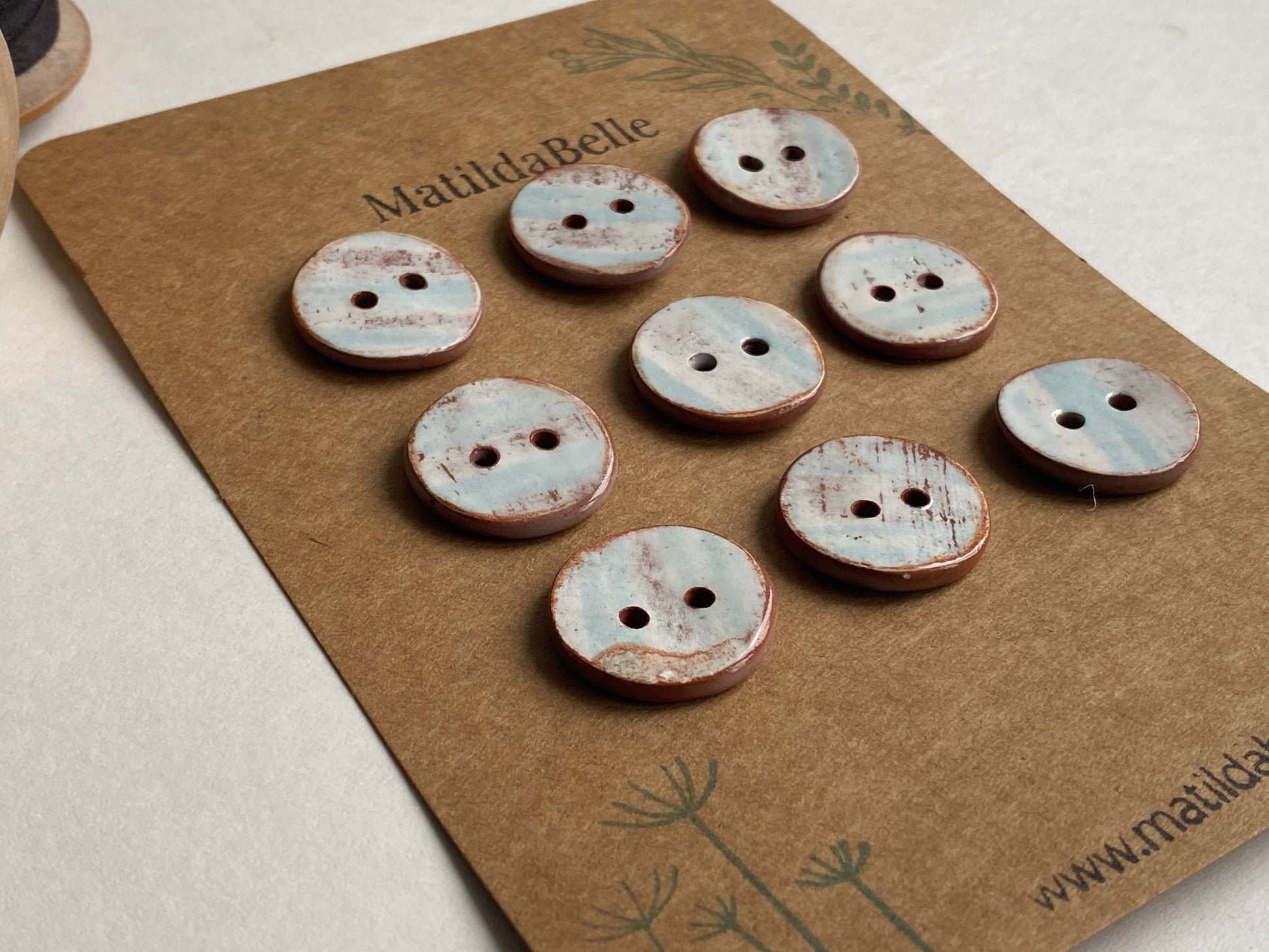 These buttons have been printed using coloured slips of white and soft blue. They have a beautiful coastal vibe and would perfect partnered with Linen and natural yarns. Handcrafted with care, they showcase the natural variations of the clay, making each button truly unique.
