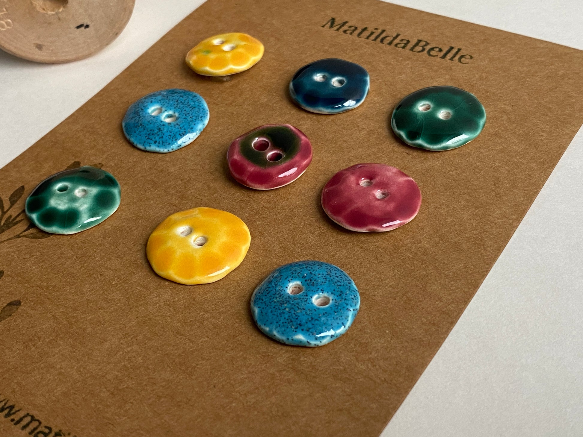 This gorgeous set of 9 Round handmade ceramic buttons have been hand formed by me from earthenware clay. Each one slightly different and jewel like!