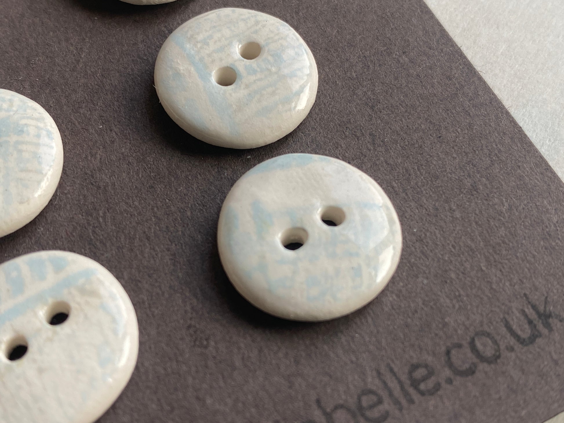 These buttons have been printed using coloured slips of Mushroom and blue. They have a beautiful coastal vibe and would perfect partnered with Linen and natural yarns. Handcrafted with care, they showcase the natural variations of the clay, making each button truly unique.