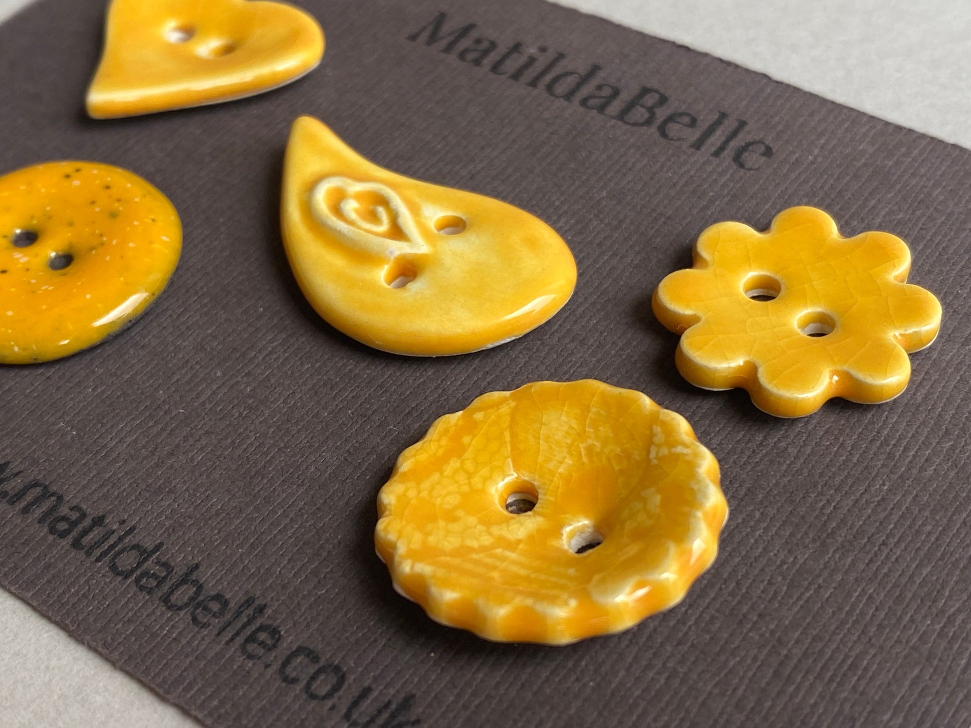 Introducing a set of five mismatched ceramic buttons inspired by vintage charm and glazed in rich Passion Fruit Yellow. Each button is uniquely shaped, adding character to your sewing and crafting projects. The set includes rounds, Heart, flower and Birdy buttons, each featuring carved details for an extra touch of elegance.