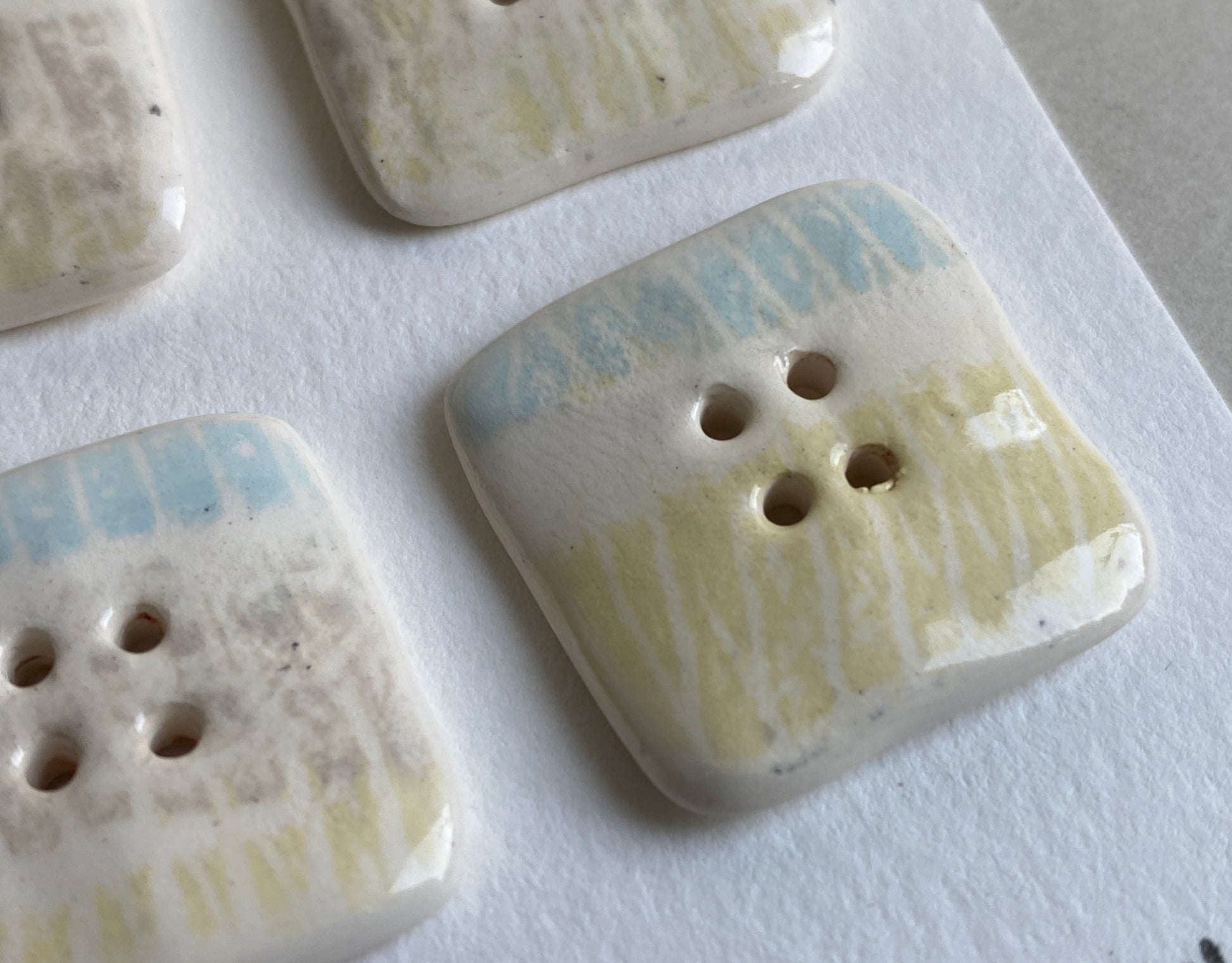 These buttons have been printed using coloured slips of Lemon, mushroom with a hint of soft blue. They have a beautiful coastal vibe and would perfect partnered with Linen and natural yarns. Handcrafted with care, they showcase the natural variations of the clay, making each button truly unique.