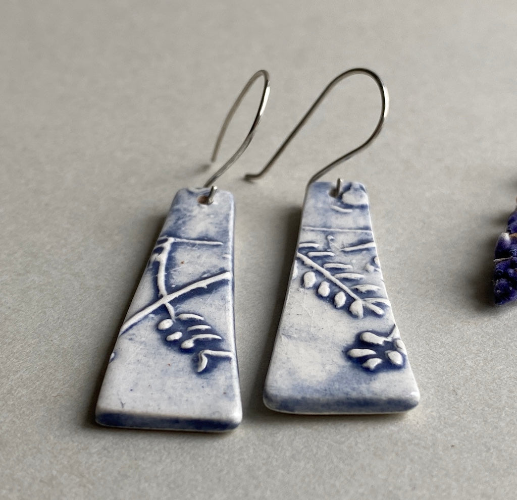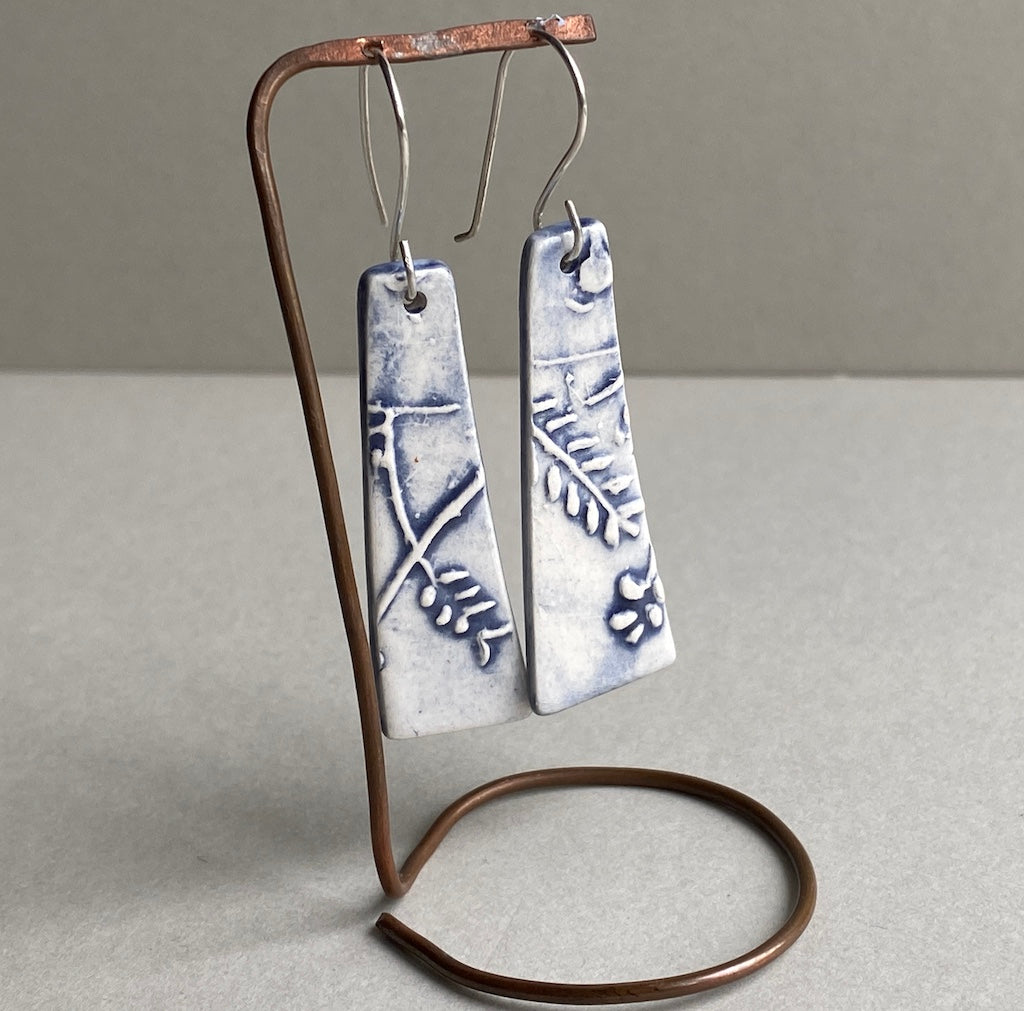 Ceramic Botanical Dangle Earrings - Glossy Navy Blue Glaze - Handmade Recycled Silver Wires
