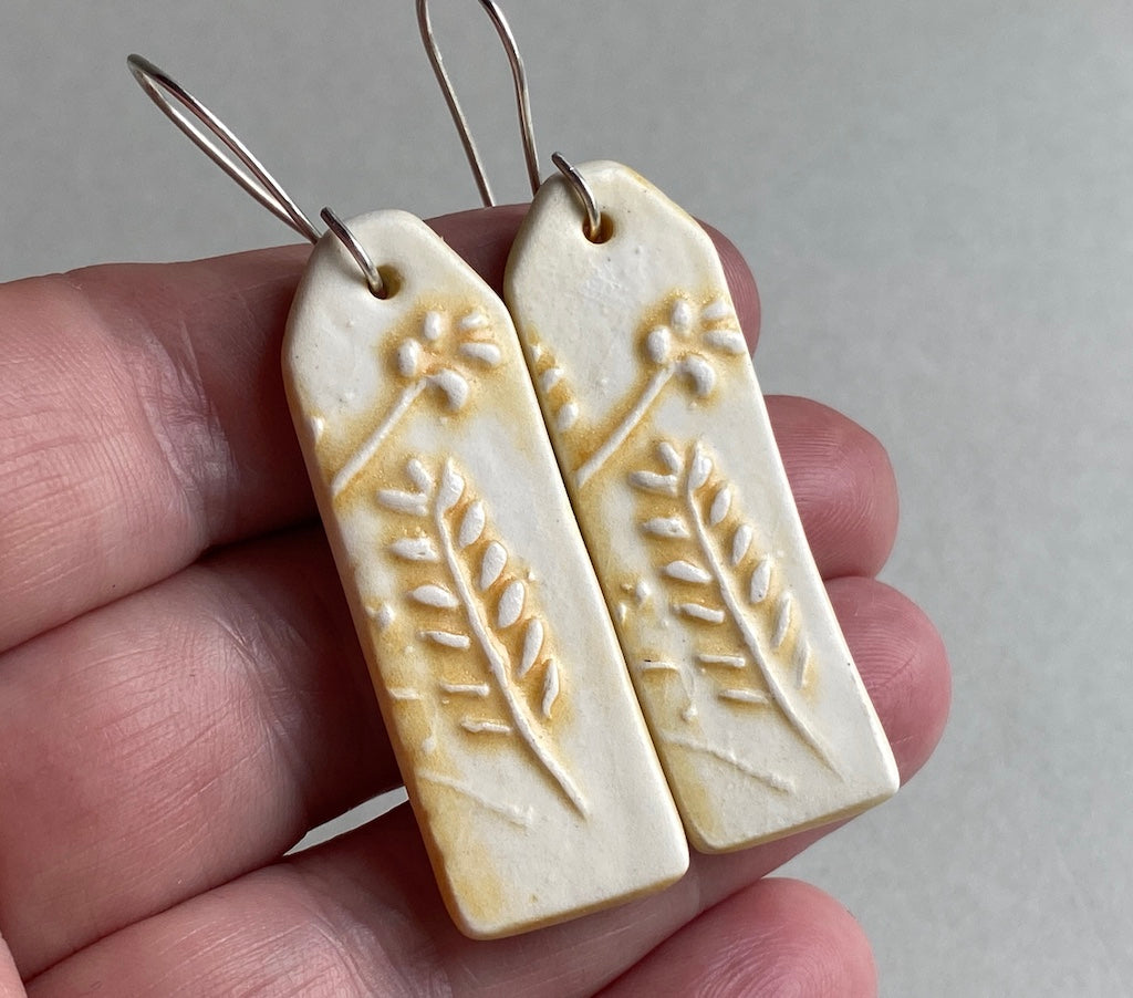 Ceramic Botanical Dangle Earrings - Yellow Glaze - Handmade Recycled Silver Wires