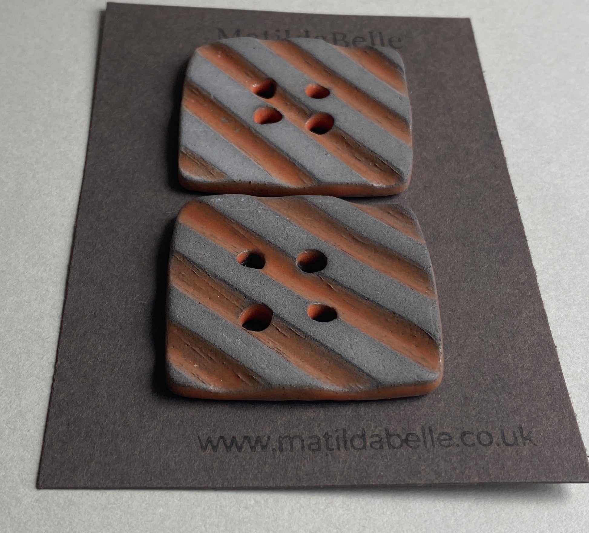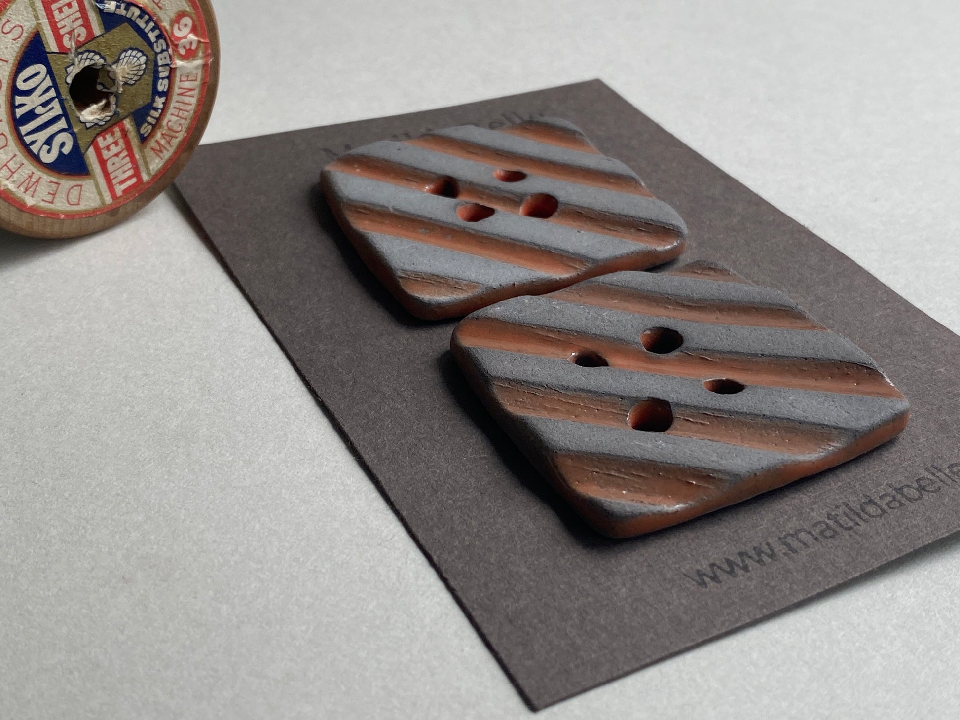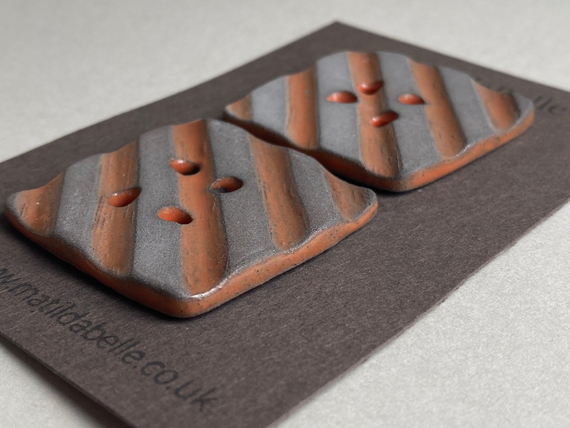 Beautiful pair of handmade Stoneware Ceramic buttons. Each button has been impressed giving textured stripes glazed in a deep orange.