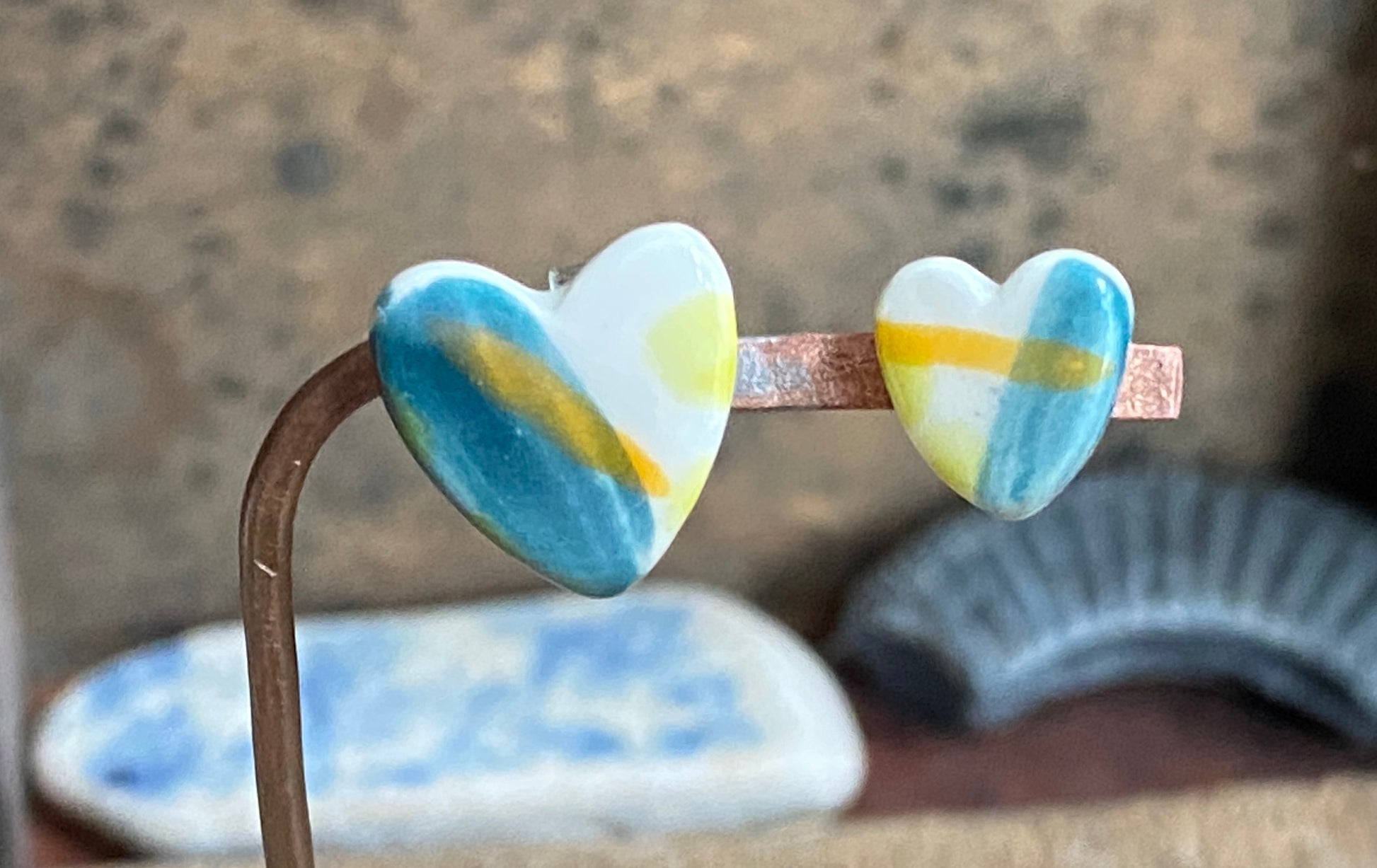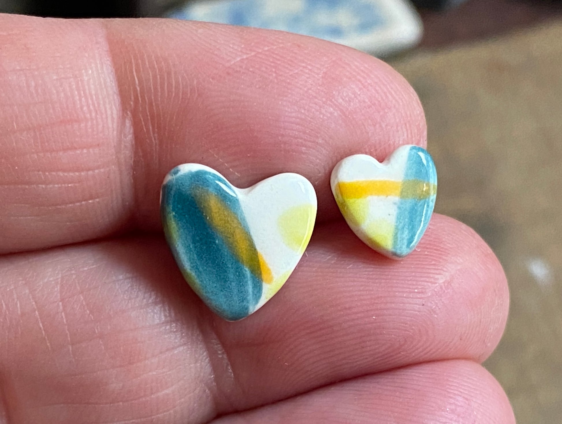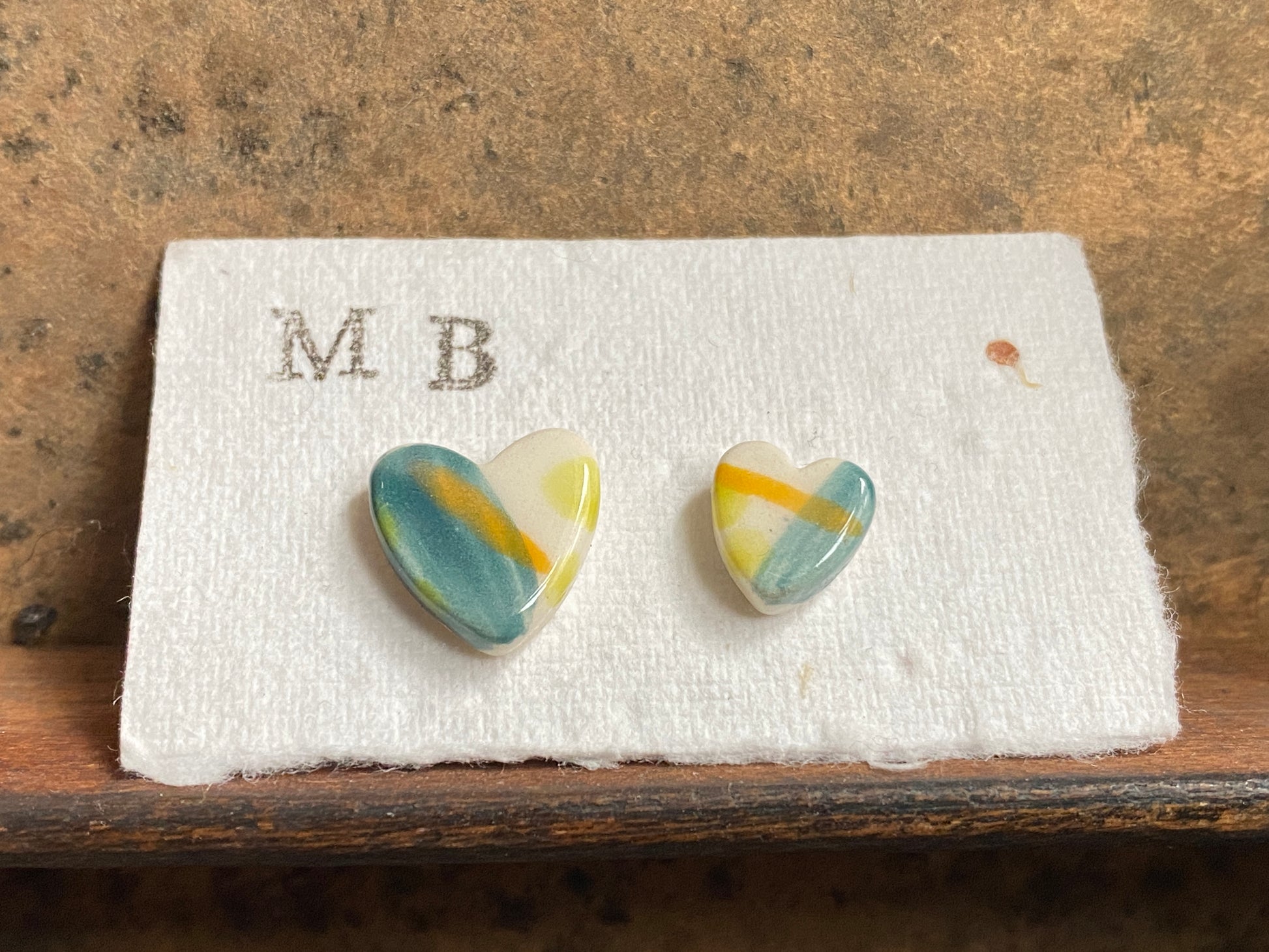 Ceramic Heart Mismatched Heart Stud Earrings - Painterly Glaze, Sterling Silver Fixings & Delicate Tones