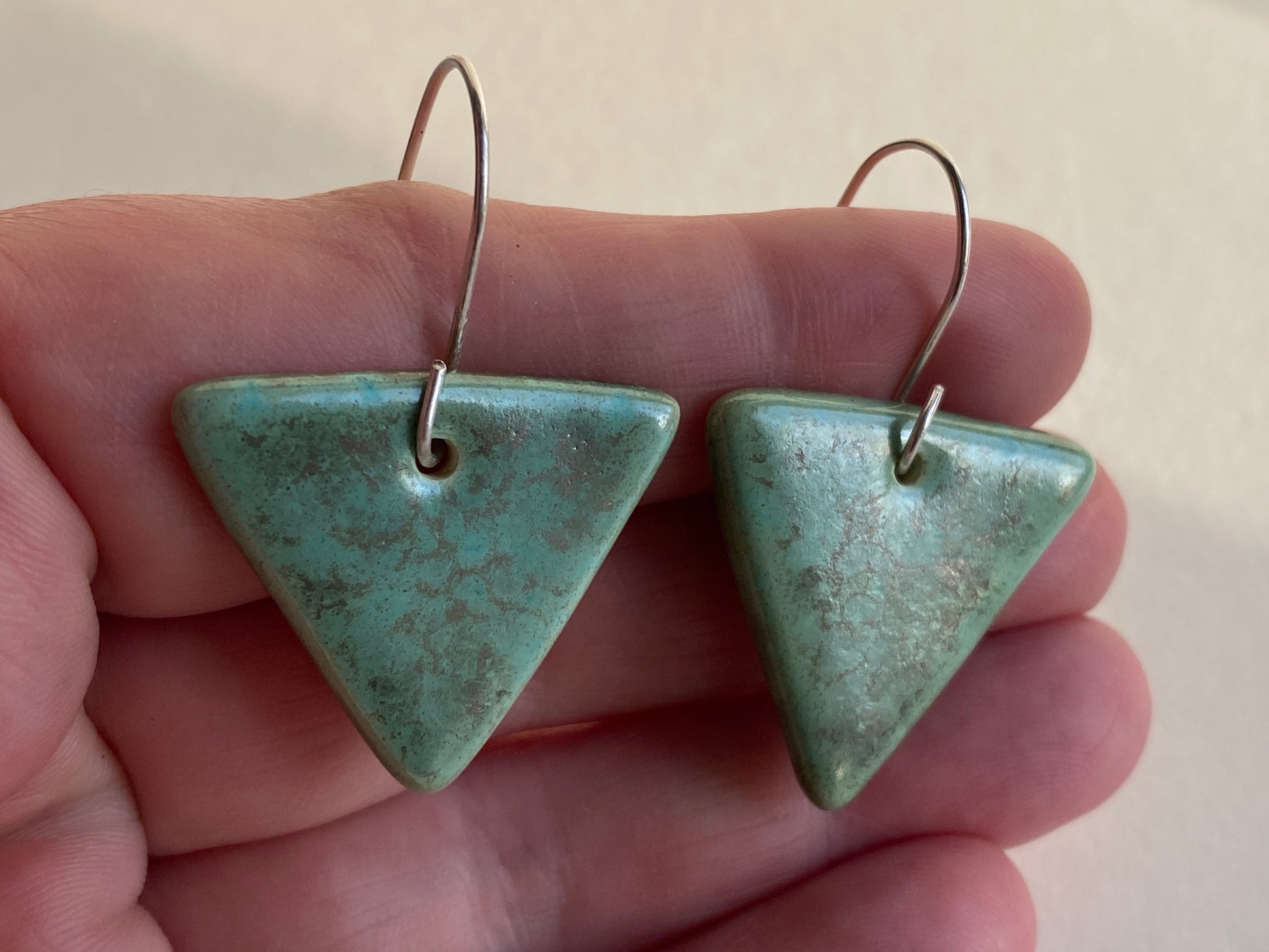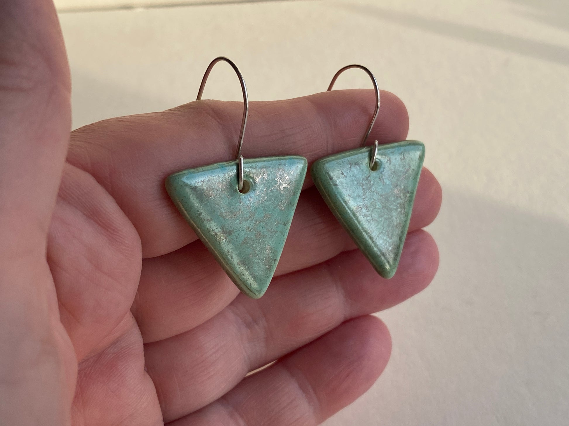 Ceramic Triangle Dangle Earrings - Green gold glaze