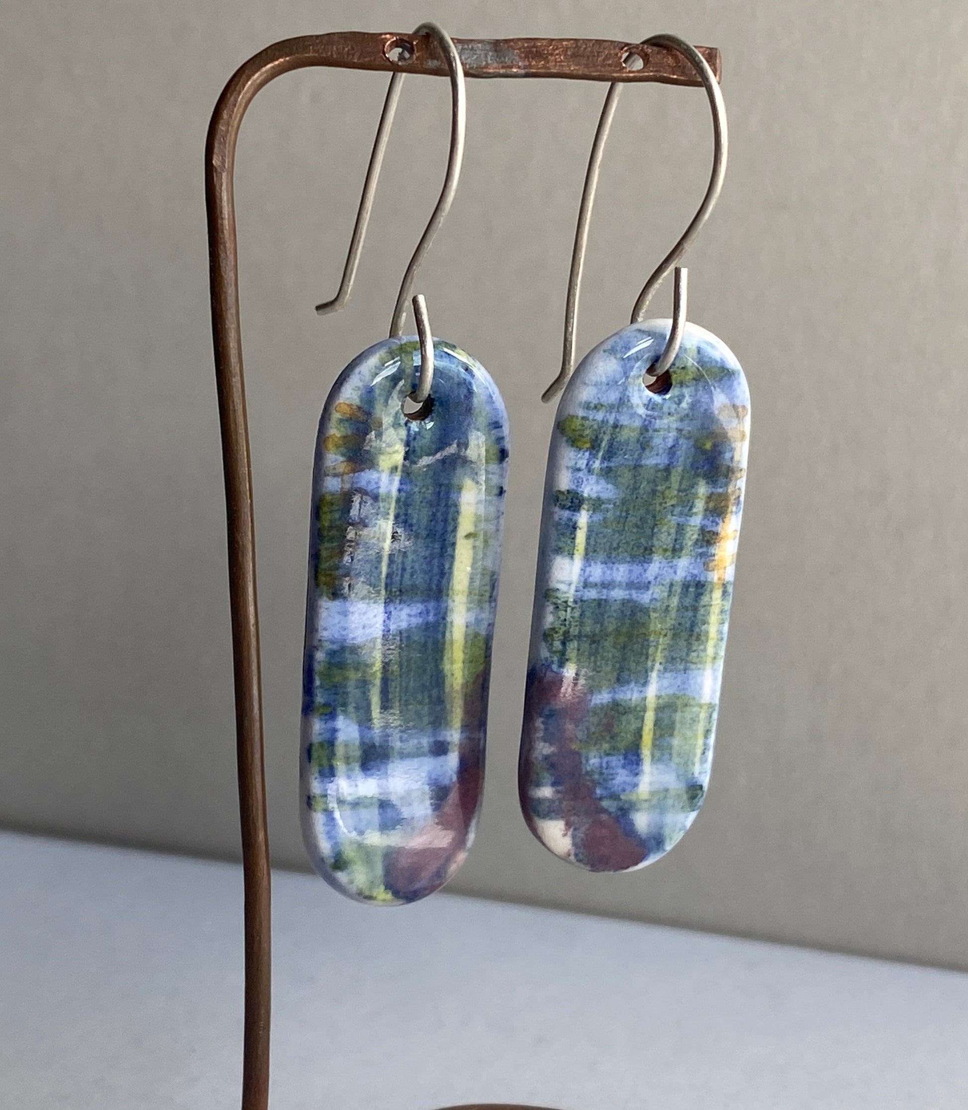 Ceramic painterly Dangle Earrings - Blues - Hung on handmade silver wires