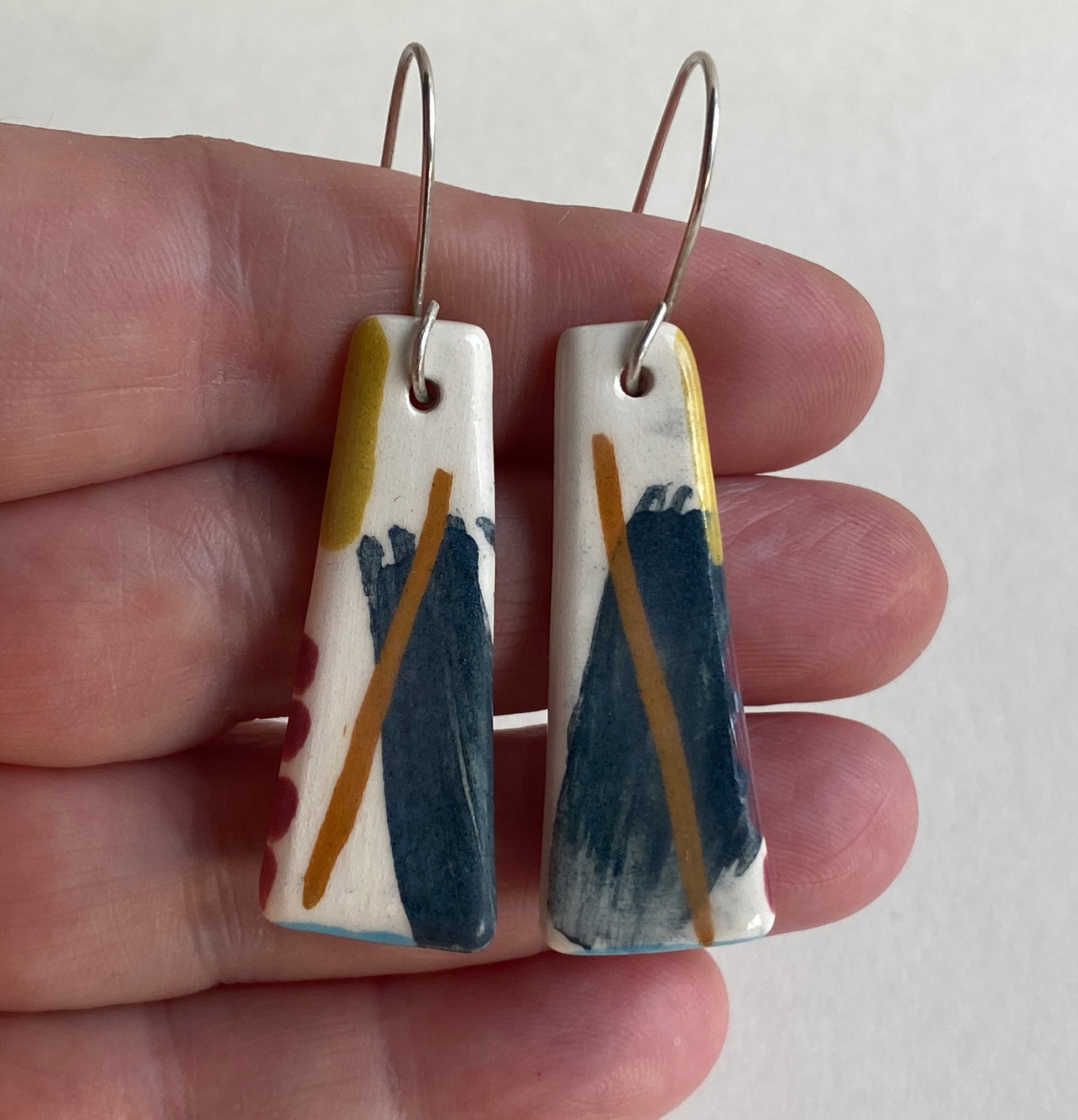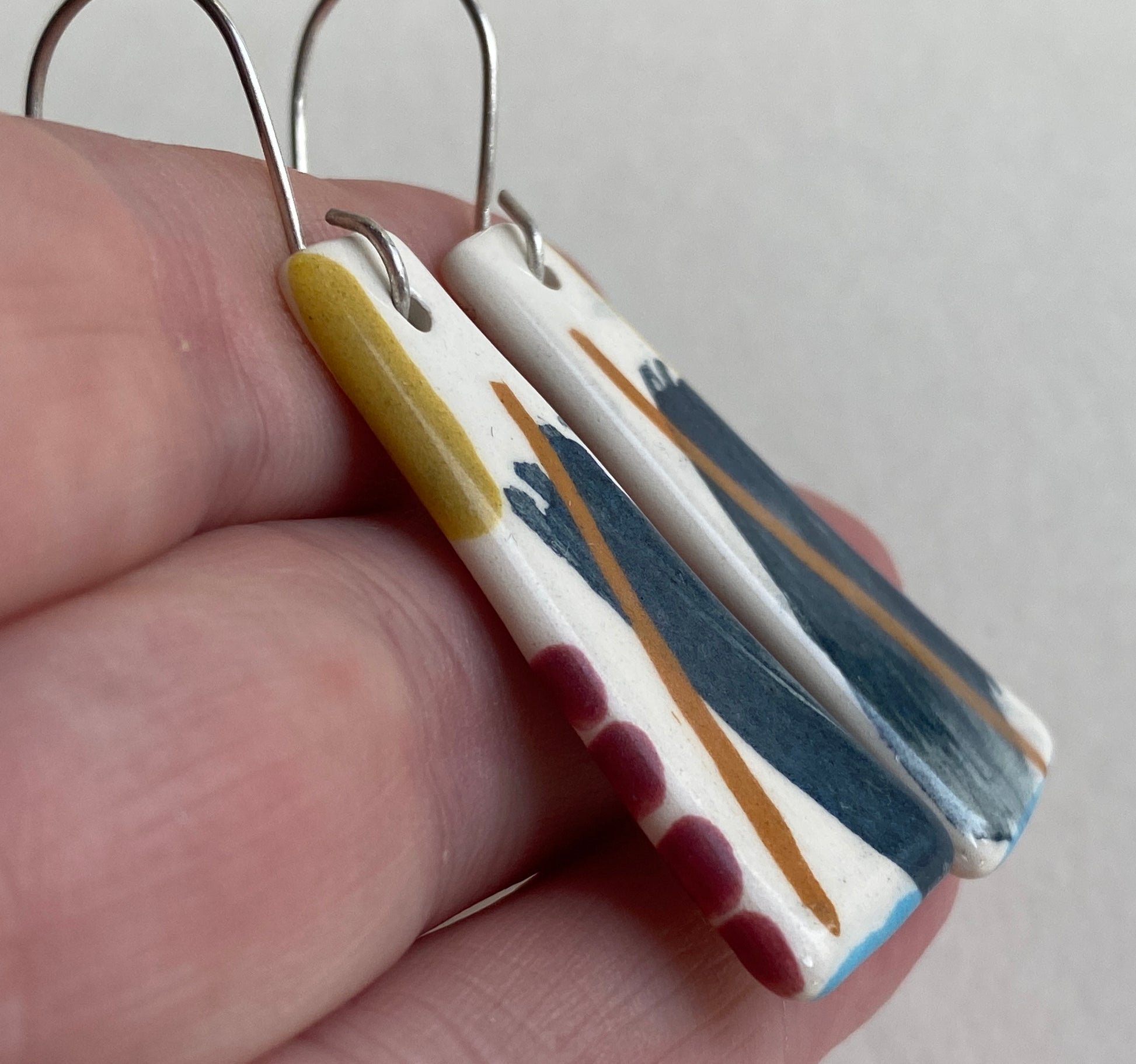 Handmade ceramic earrings, each one a unique work of art crafted from earthenware clay. These earrings are hand painted in a gorgeous coastal palette reminiscent of evenings by the sea.