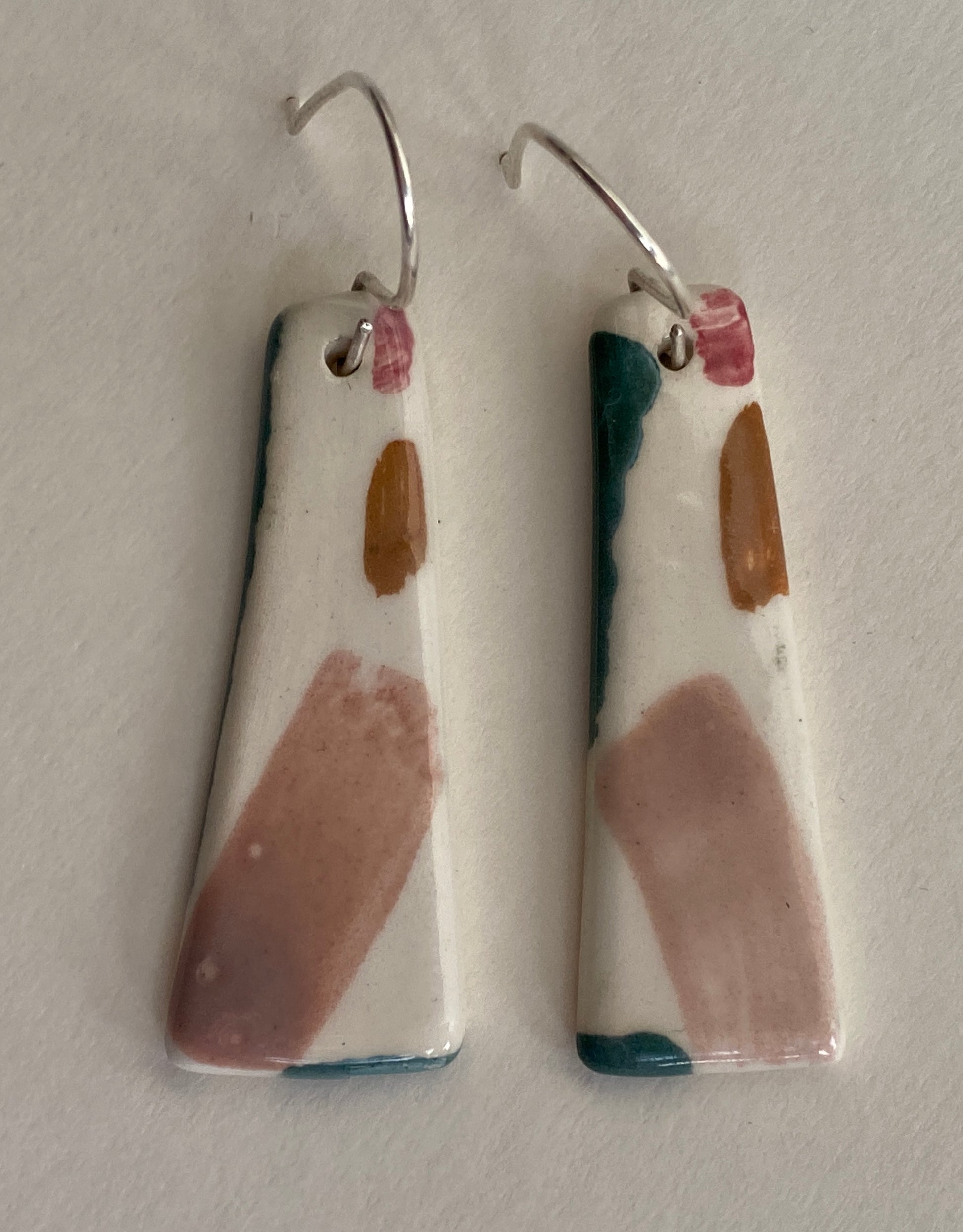 Handmade ceramic earrings, each one a unique work of art crafted from earthenware clay. These earrings are hand painted in a gorgeous palette of Nude pink, ochre, teal and burgundy.