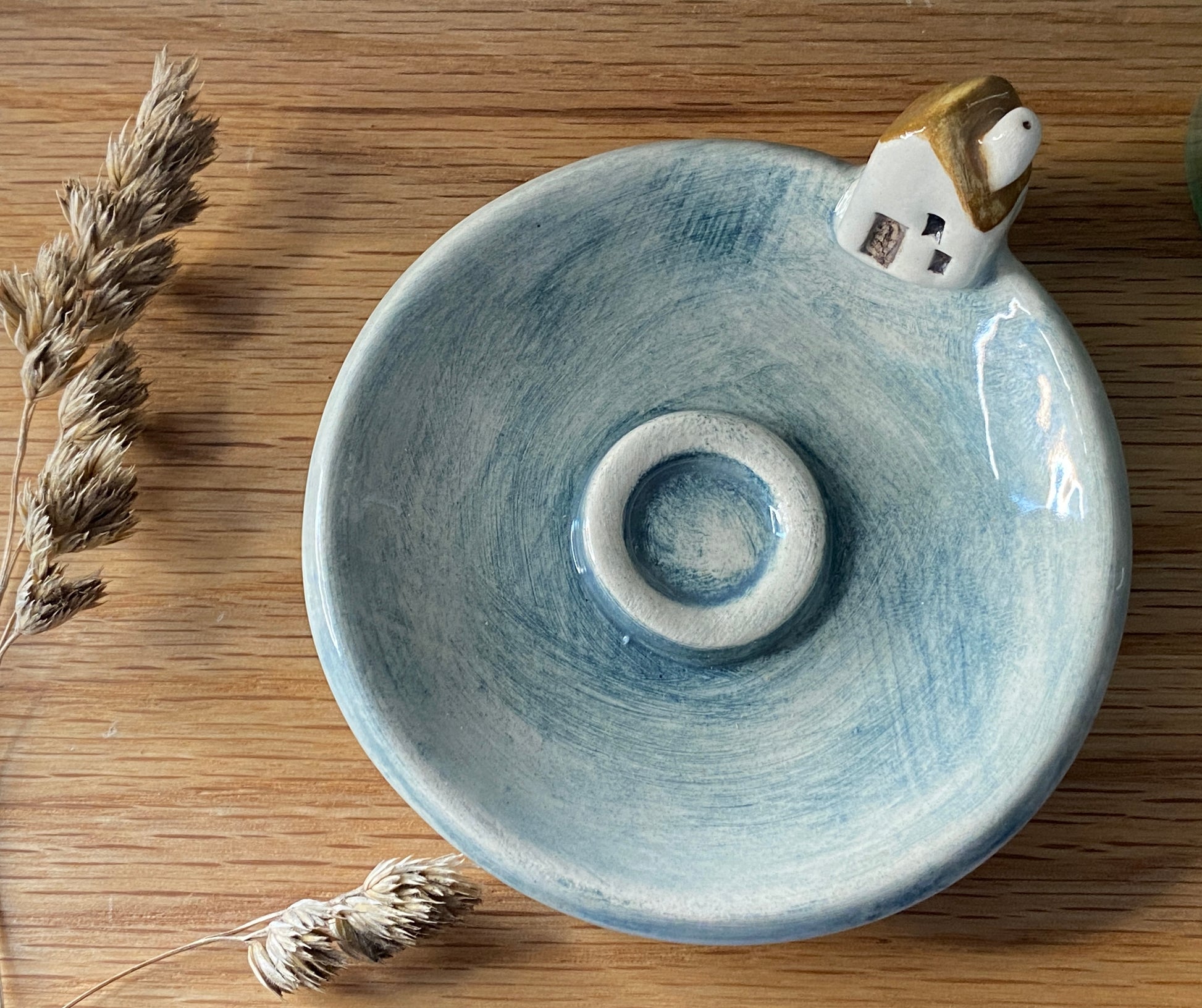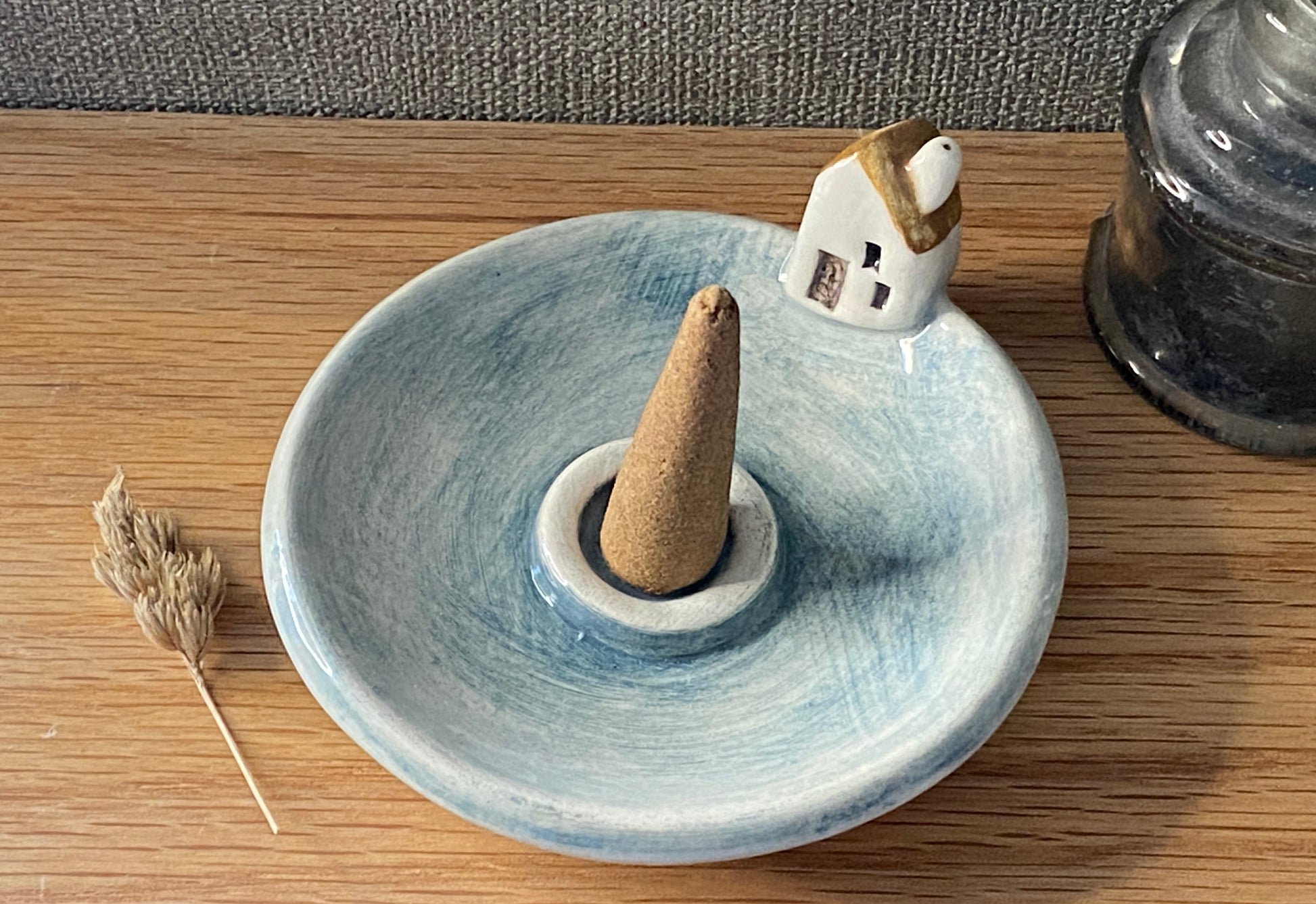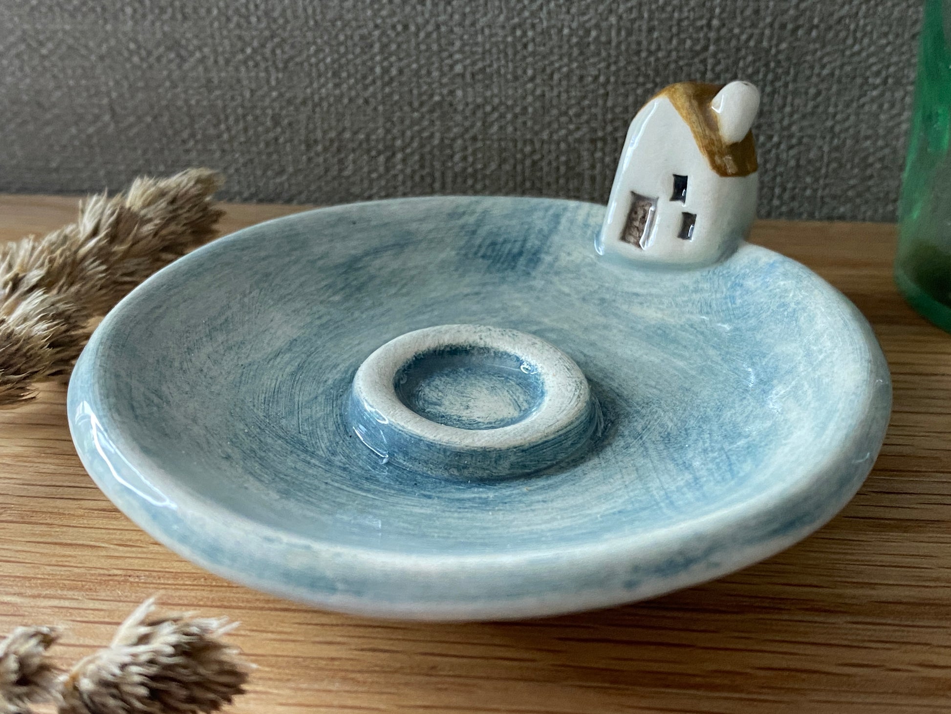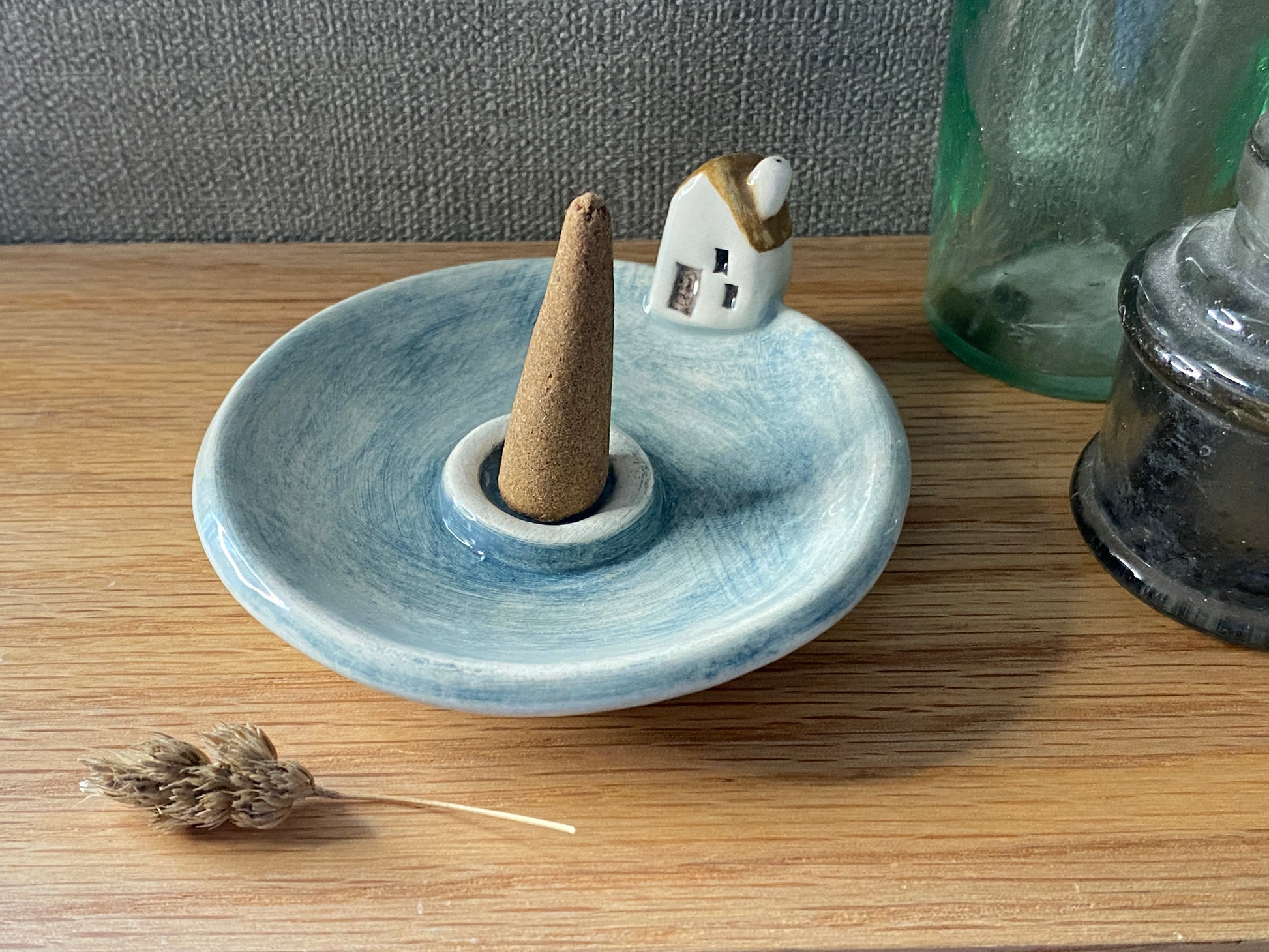 From my little garden studio in North Yorkshire, I’ve hand-formed a charming new home hanging from earthenware clay. It measures 6 x 7 cm and hangs on a high-quality grey ribbon. The set also includes a beautiful incense cone holder, 7 cm across, glazed in a watercolor-style blue with an ochre roof and a tiny ceramic cottage. To complete the set, there’s the sweetest mini house.