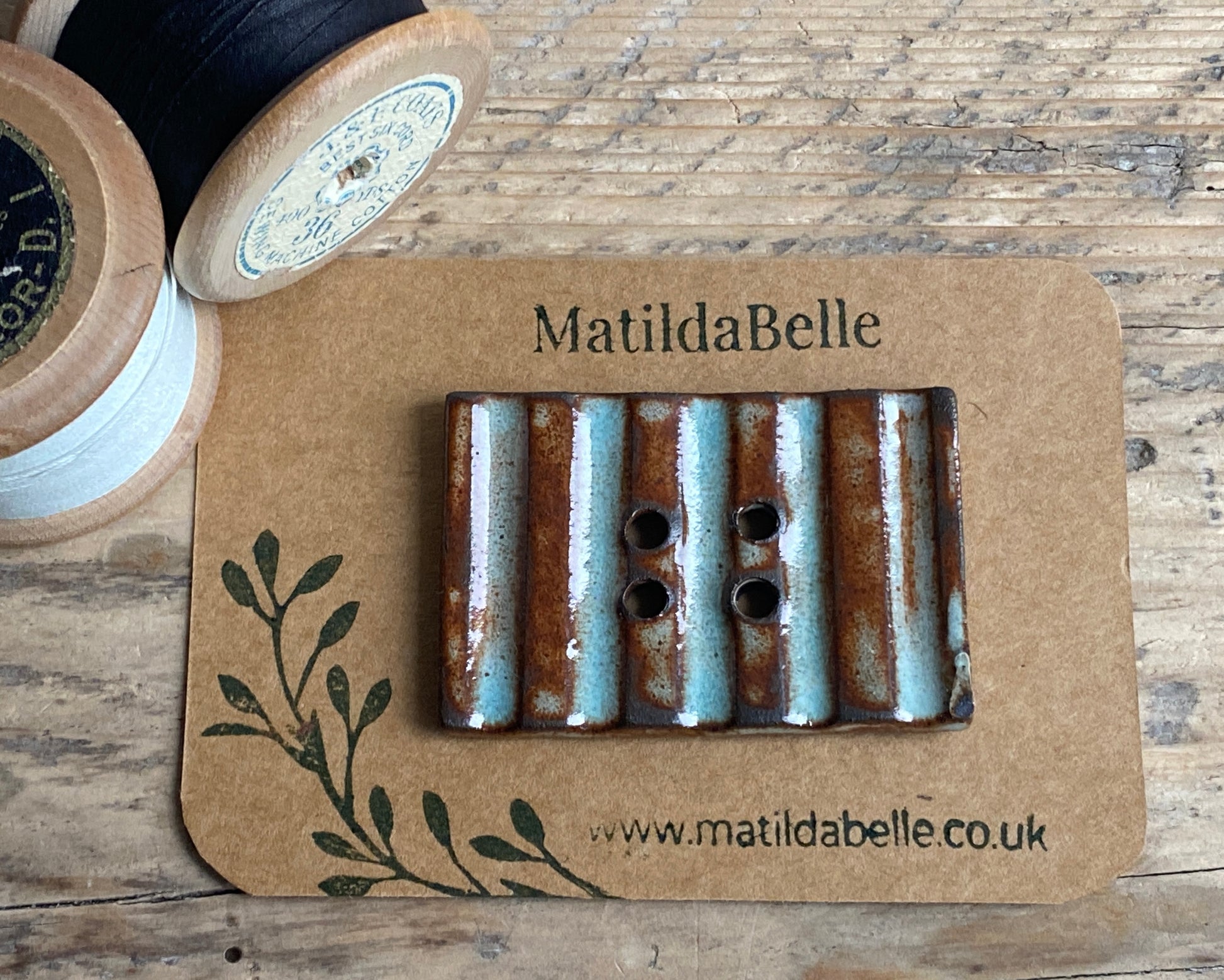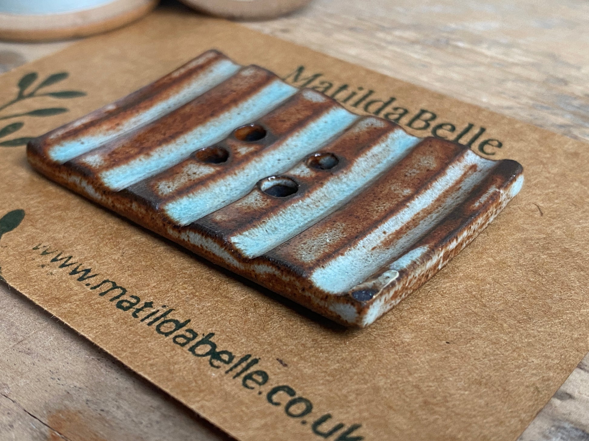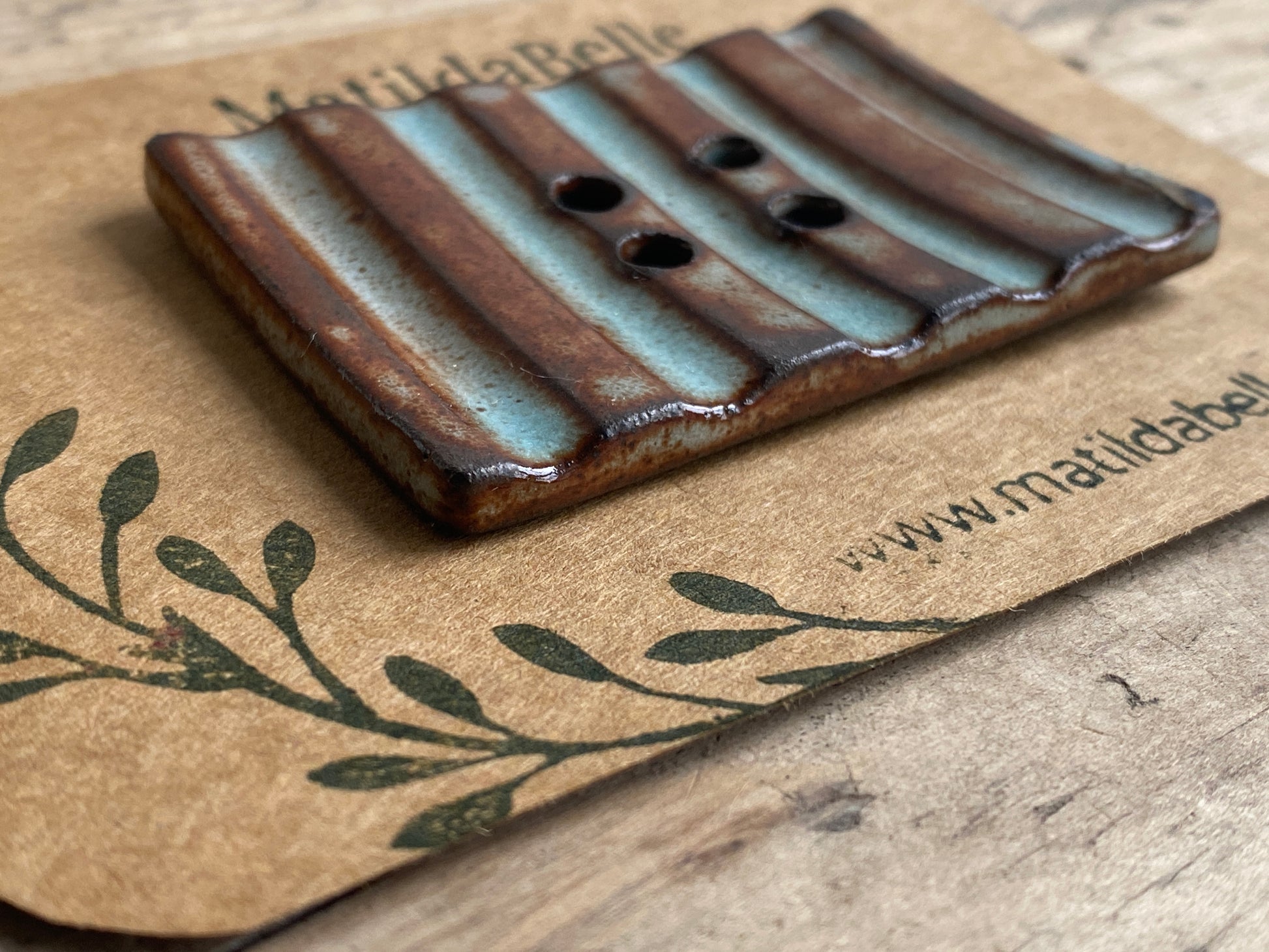 Large button measures 60mm x 40mm with a 4mm depth and four extra large stitch holes. This gorgeous Button has been hand formed from black stoneware clay and glazed in a rusty Turquoise which changes over the ripples of the button.