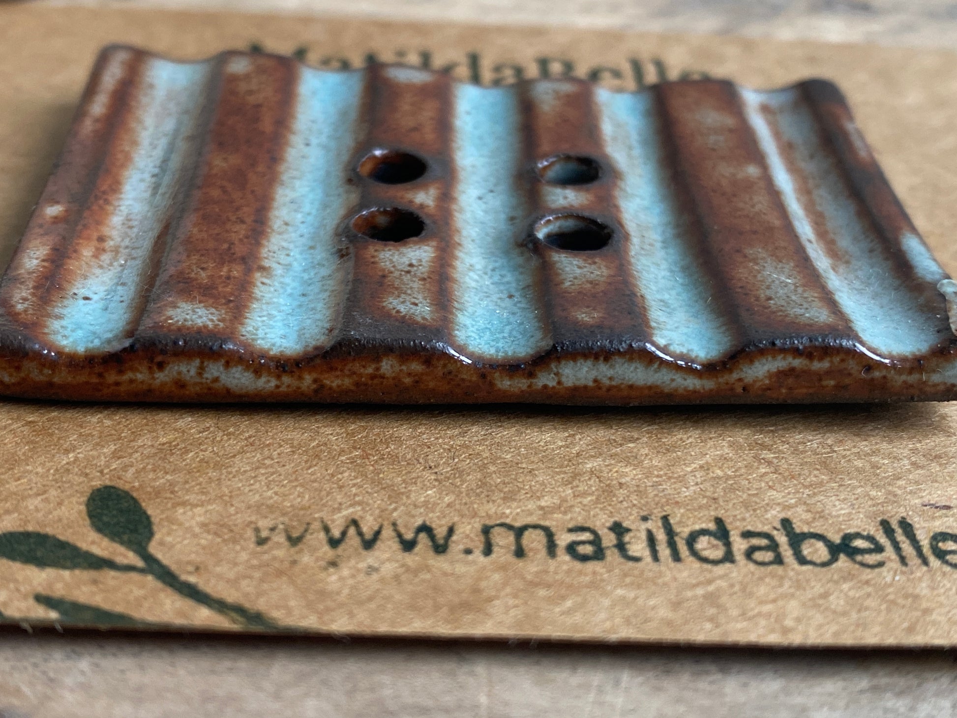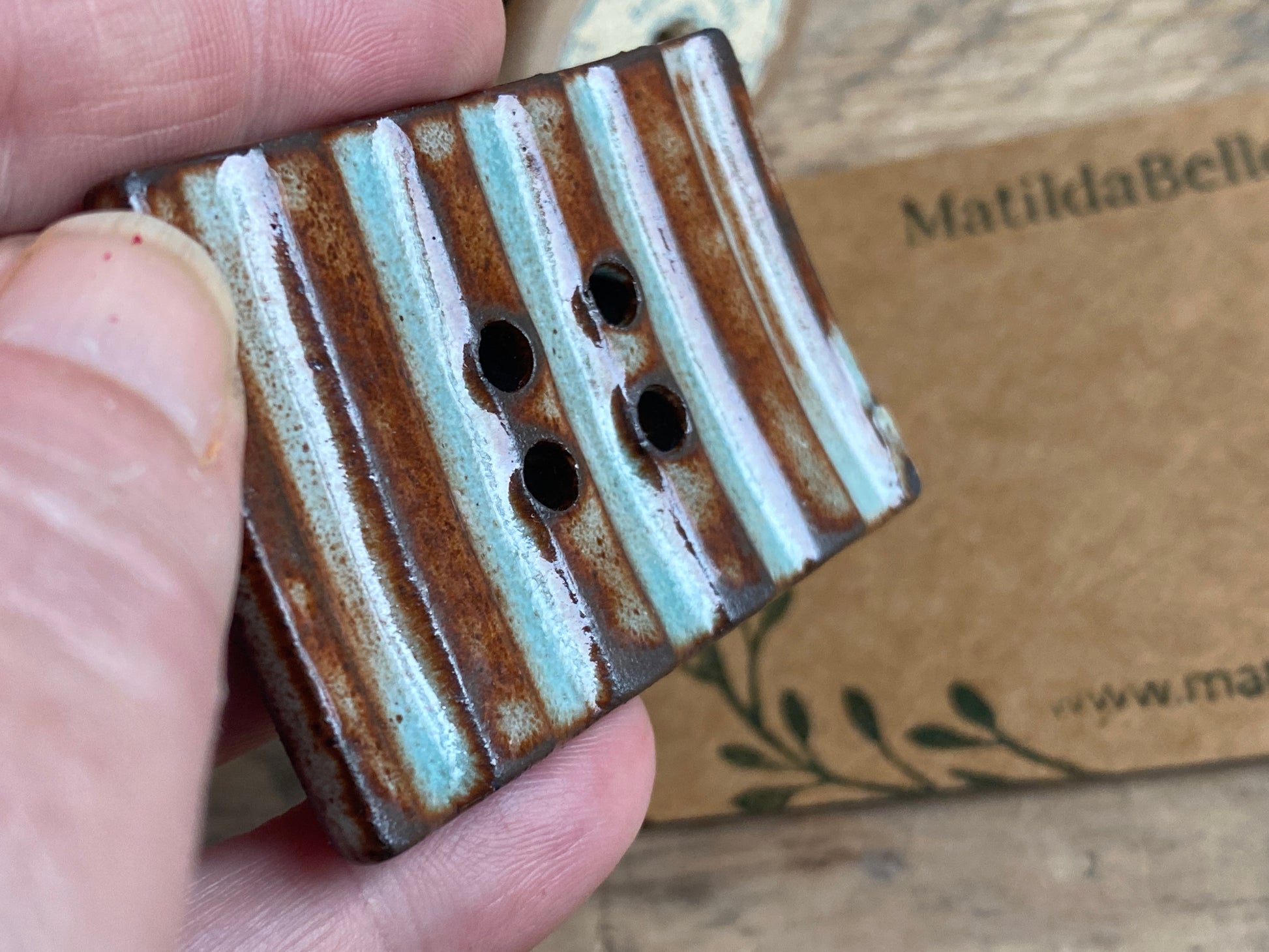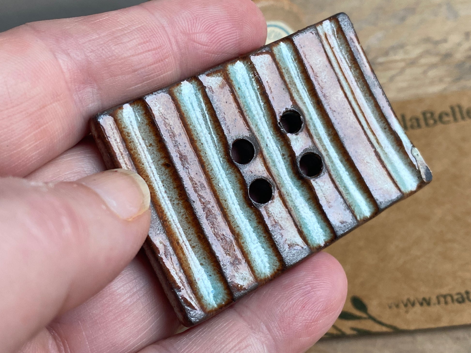 Large button measures 60mm x 40mm with a 4mm depth and four extra large stitch holes. This gorgeous Button has been hand formed from black stoneware clay and glazed in a rusty Turquoise which changes over the ripples of the button.