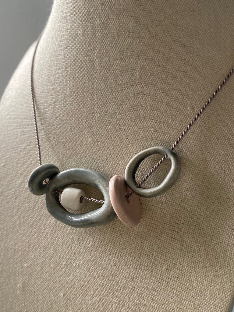 Handmade Ceramic Bead Necklace - Pastel Palette, Grey Silk Cord,