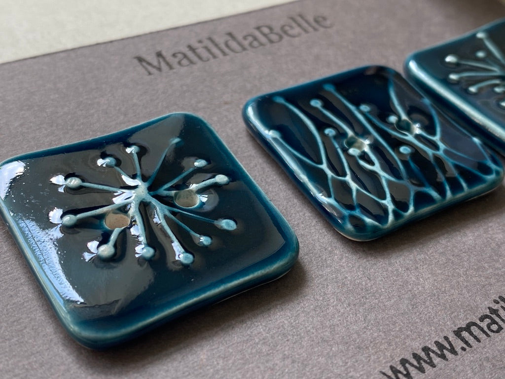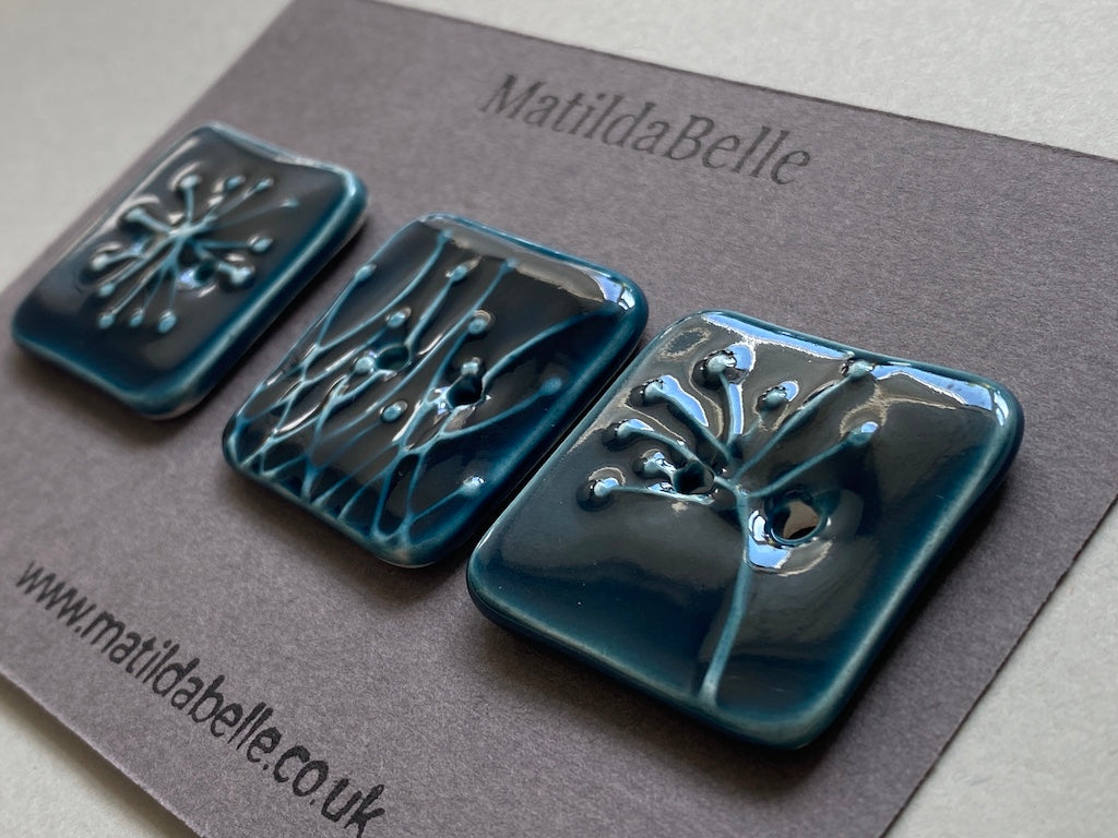 Handmade 35mm Ceramic Botanical Buttons Set of 3 - Square Design Petrol Blue