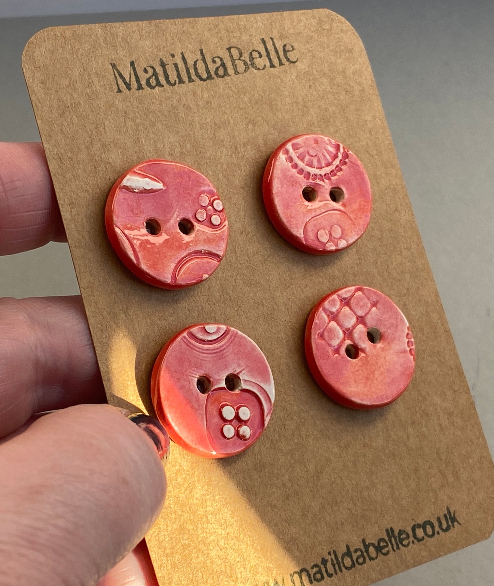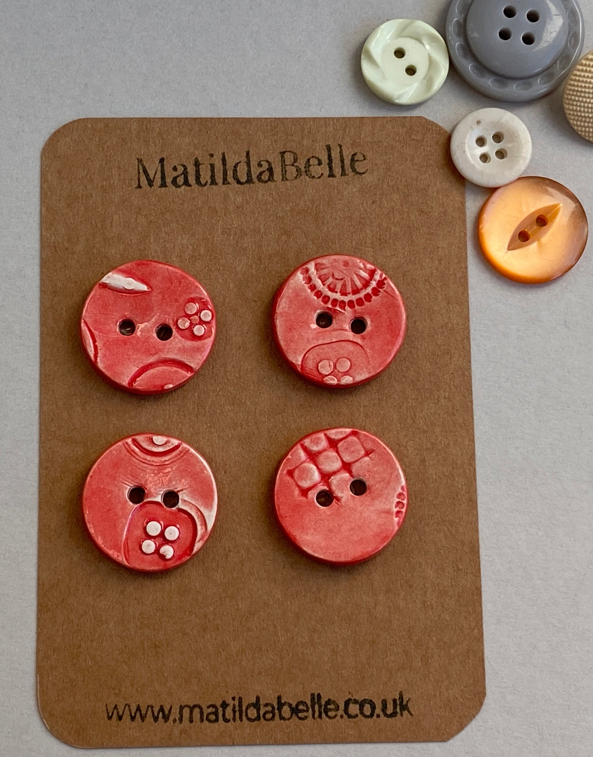 Handmade by me in my little home pottery studio. These earthenware buttons have been imprinted with vintage buttons from my Nanna's buttons tin.