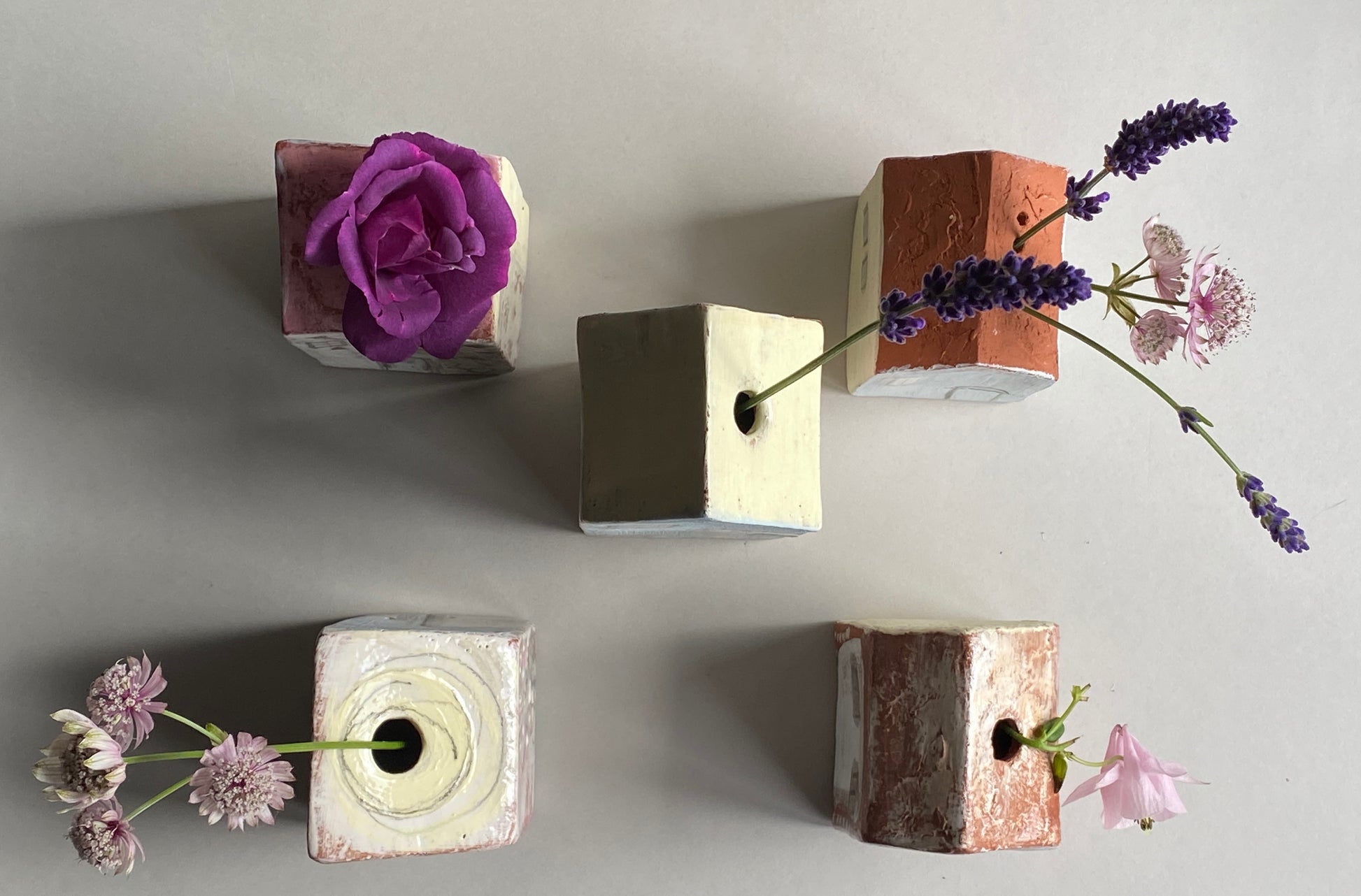 Our Handmade Ceramic Dry Vase Houses are crafted from red earthenware clay and decorated with pastel-coloured slips and glazes. Inspired by the beautiful North Yorkshire village where I live, these vases capture the charm of rolling fields, climbing roses, village barn owls, and big dark skies. Each piece features naively illustrated country cottages with rose gardens and moons, making them unique and collectible.
