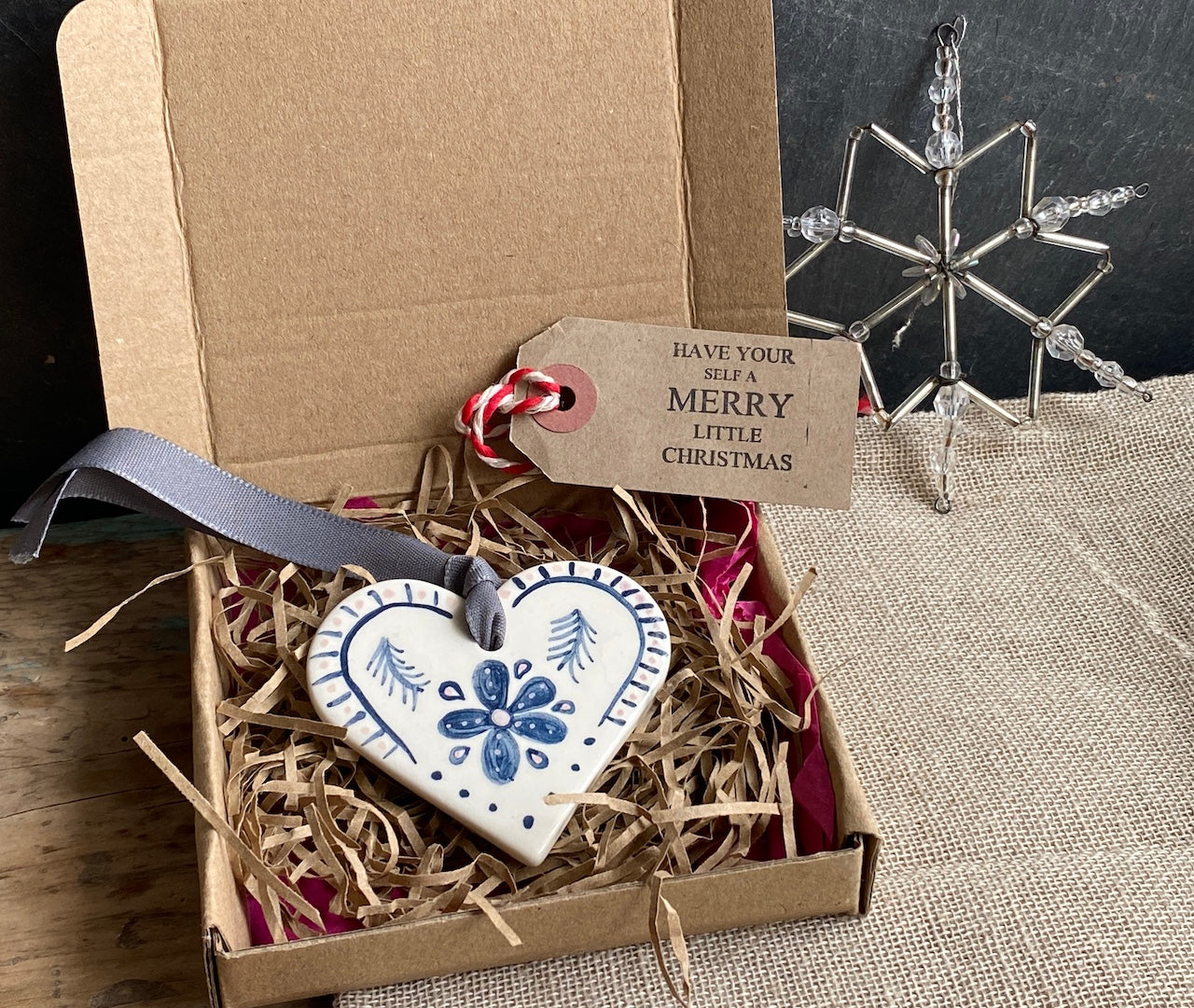 Hung by a high quality grey ribbon this heart is a perfect Christmas treat ready to be hung on the tree or by the fire side.