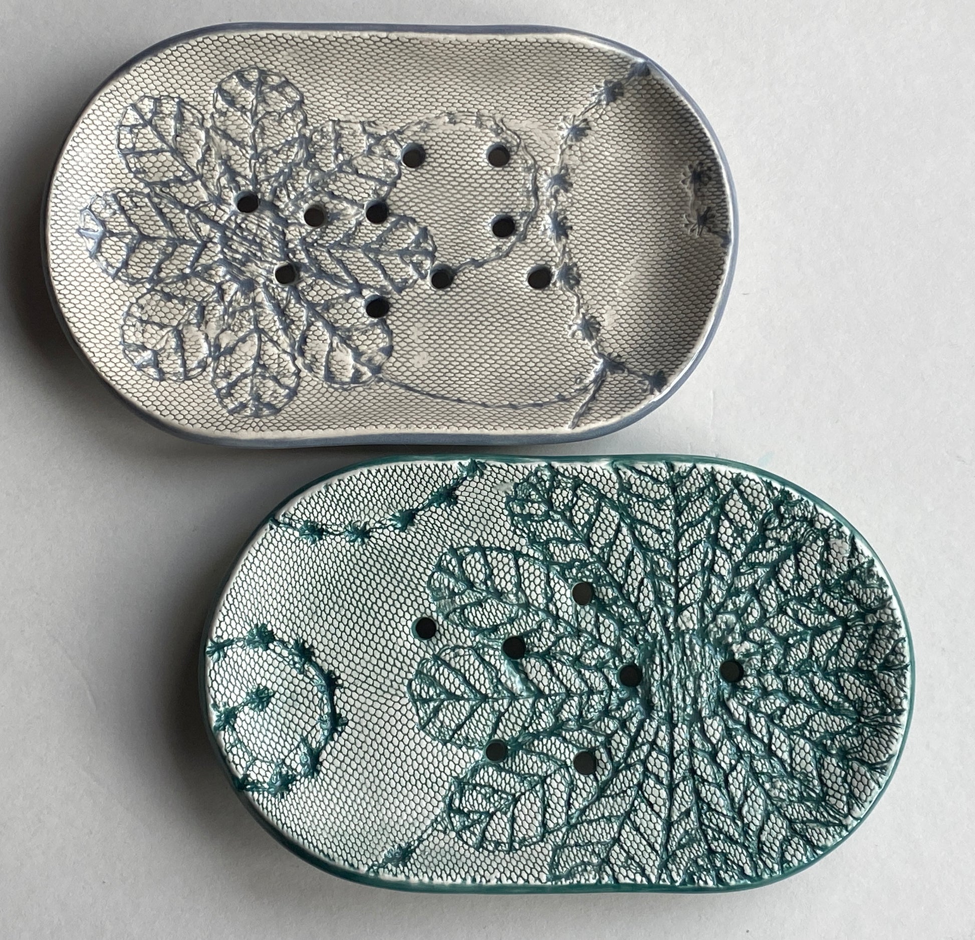 This beautiful dish has been imprinted with a Vintage Crochet Shawl. Glazed in a rich Blue / Grey and rubbed back to further reveal the unique pattern.