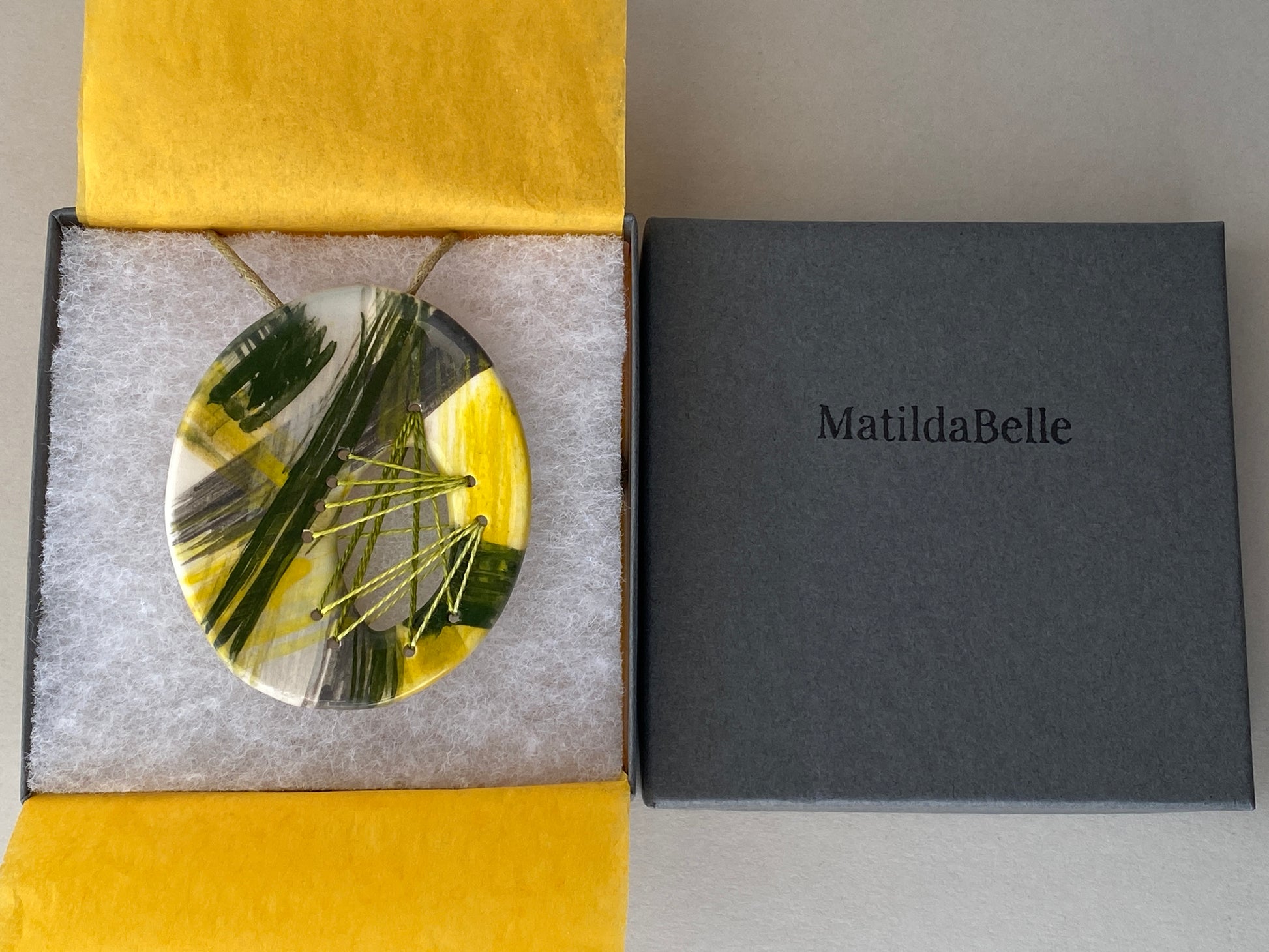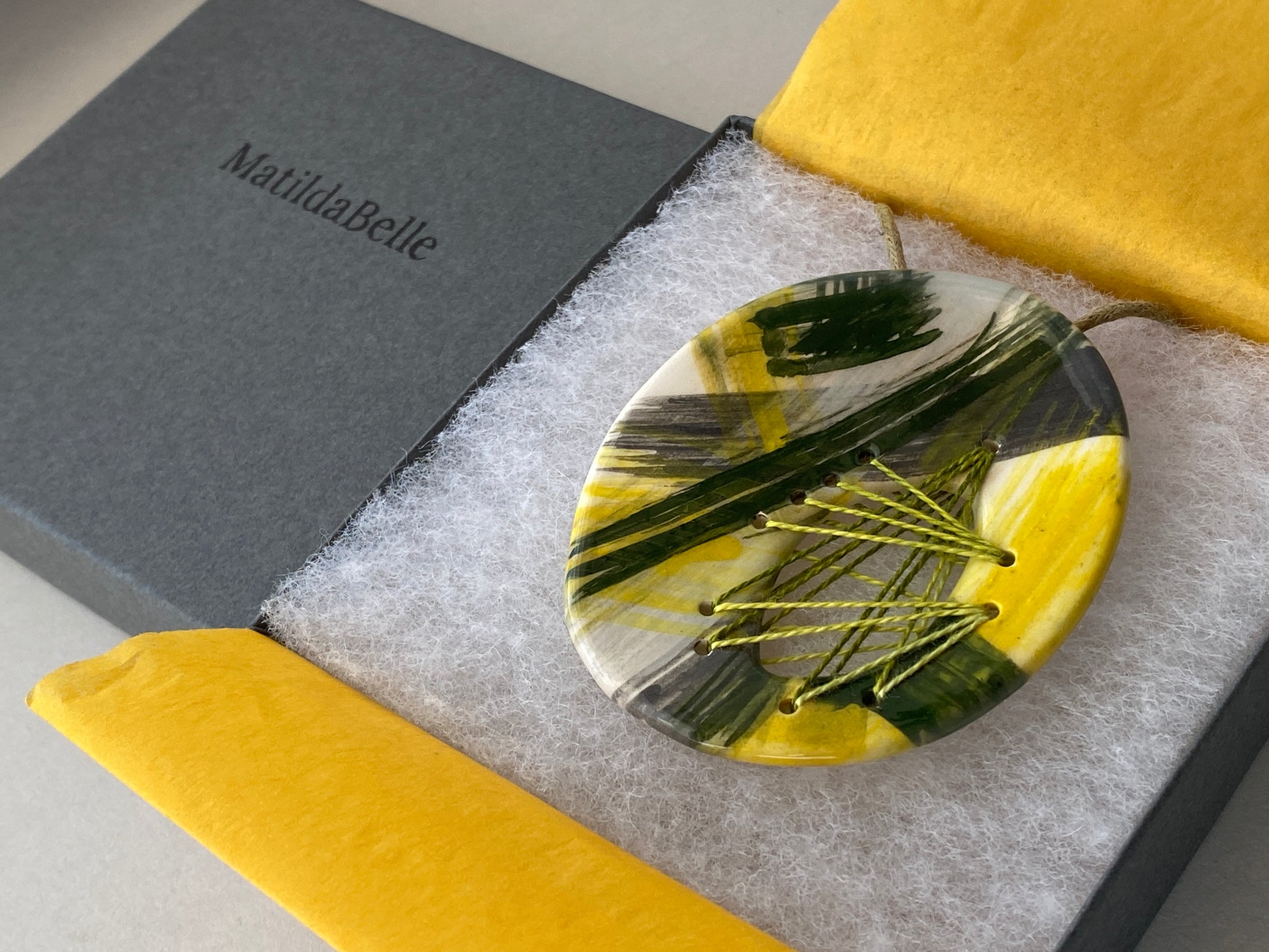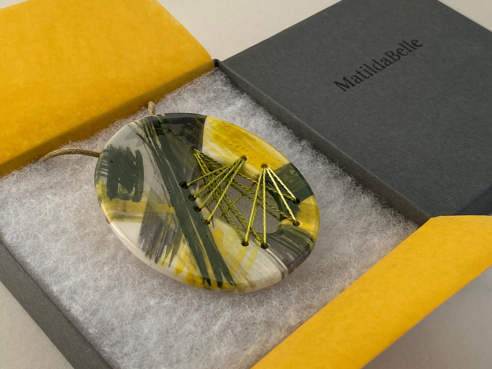 This handmade ceramic oval pendant necklace is crafted from Earthenware clay and twice fired for strength. Inspired by my childhood, growing up surrounded by a family of sewers, each pendant in this collection brings together my love for stitching and ceramics.