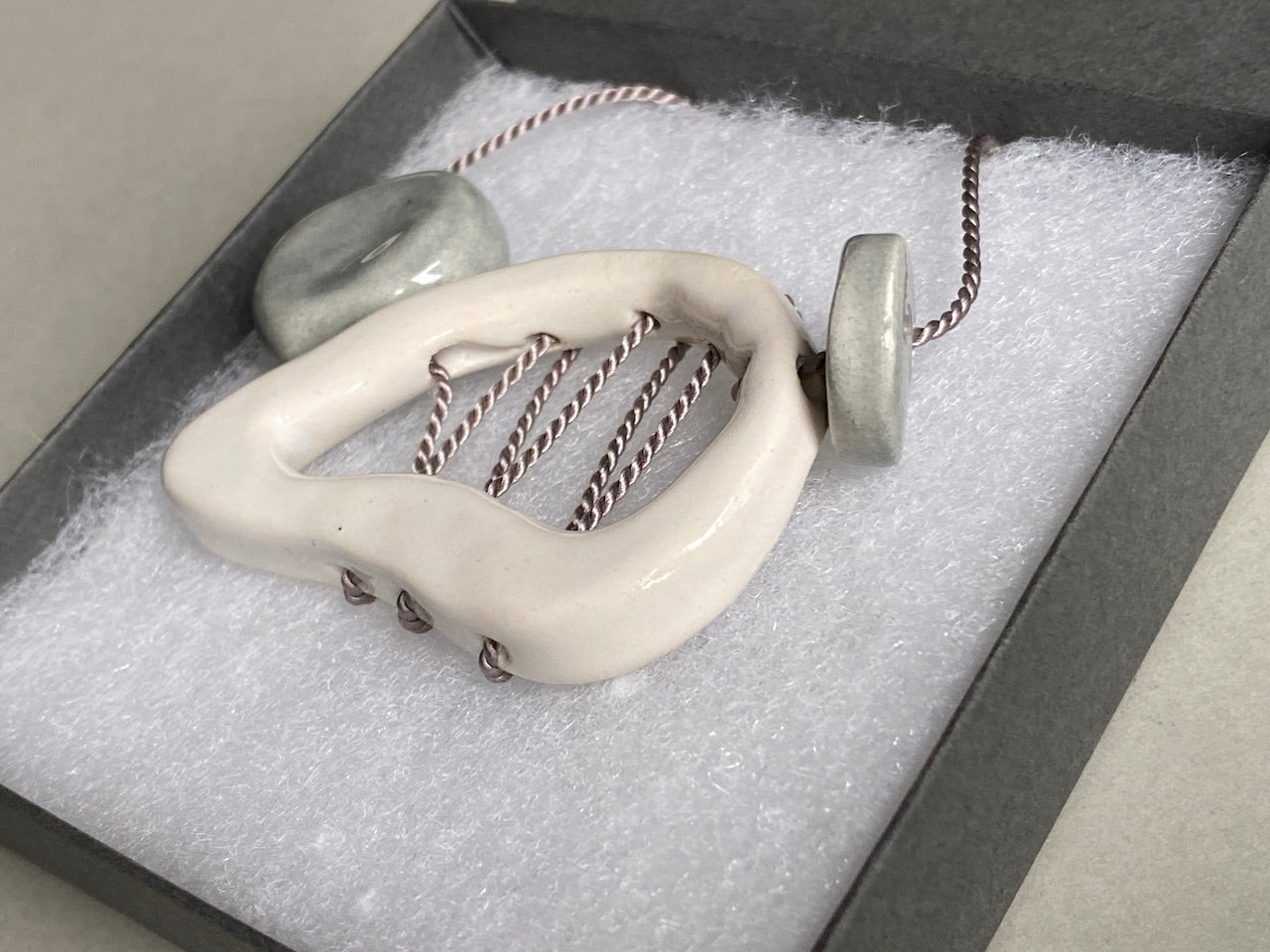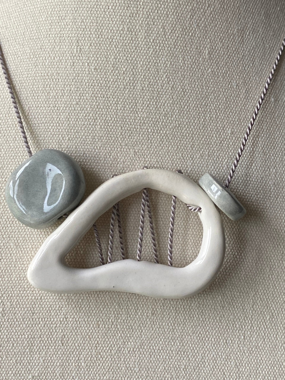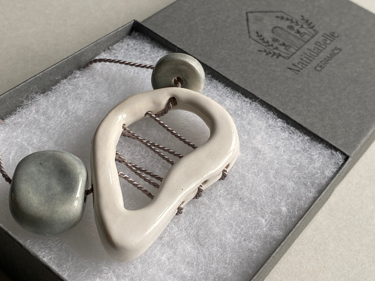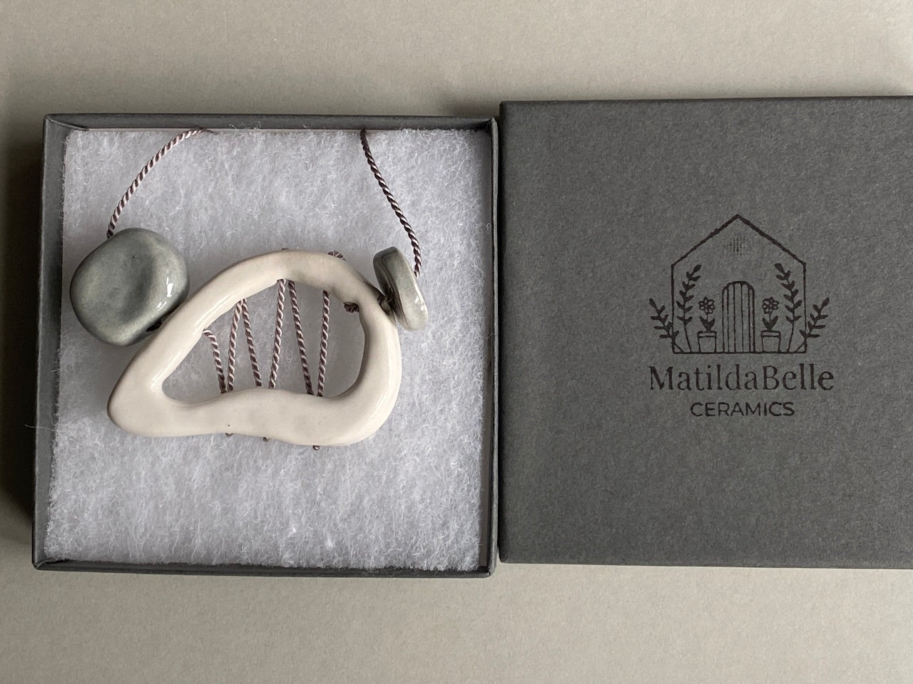 Introducing our Handmade Ceramic Statement Pendant Necklace – a truly unique piece. It features a large, hand-formed bead with organic stitching that’s actually part of the silk necklace itself. Glazed in a clean white, this pendant is a real standout.