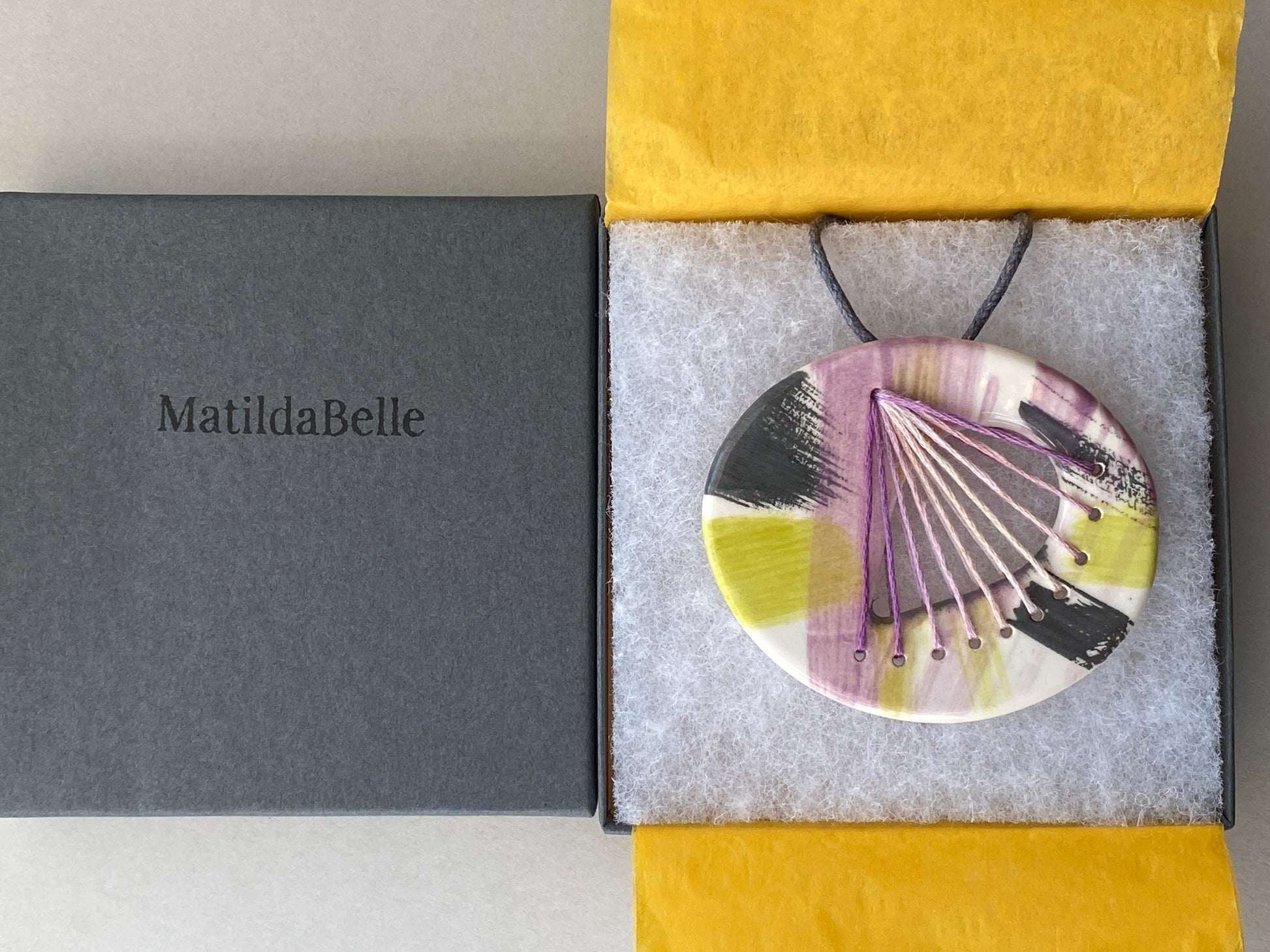This pendant has been glazed in beautiful tones of Lilac, grey, lime and black which are influenced by the colours I’m surrounded by here in North Yorkshire—from the moors to the dry stone walls.