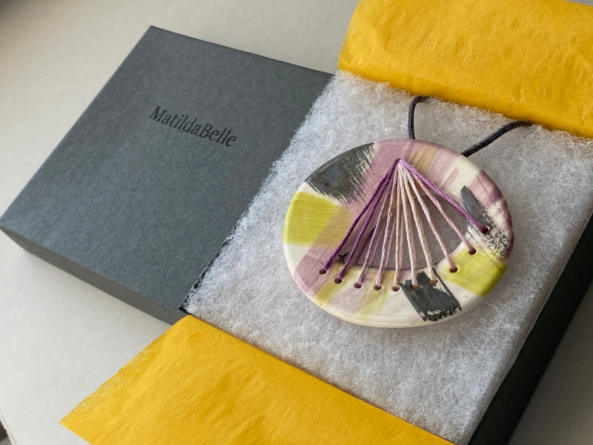 This handmade ceramic oval pendant necklace is crafted from Earthenware clay and twice fired for strength. Inspired by my childhood, growing up surrounded by a family of sewers, each pendant in this collection brings together my love for stitching and ceramics.