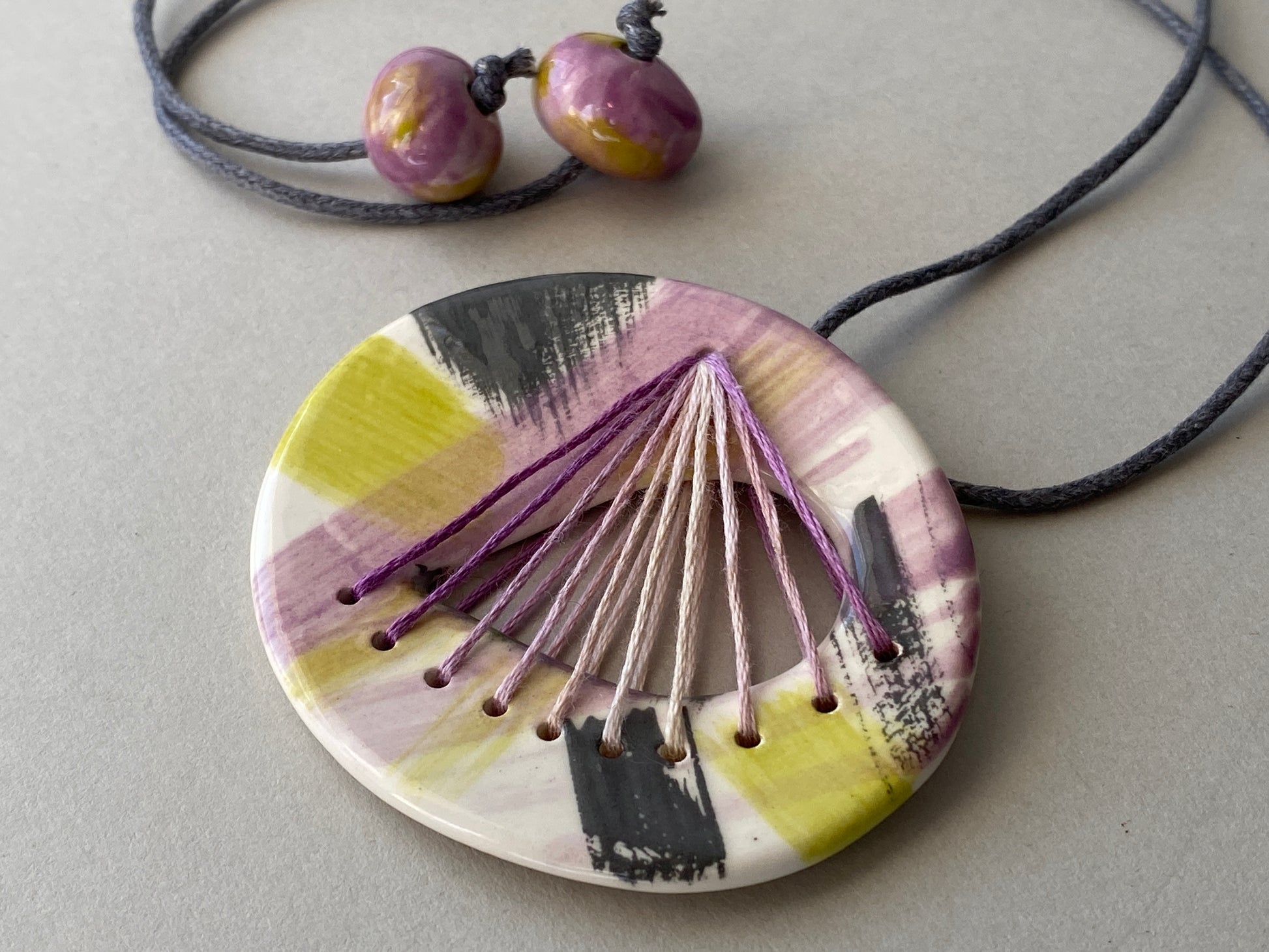 Handmade Ceramic Stitched Pendant Necklace large Oval Lilac and Lime