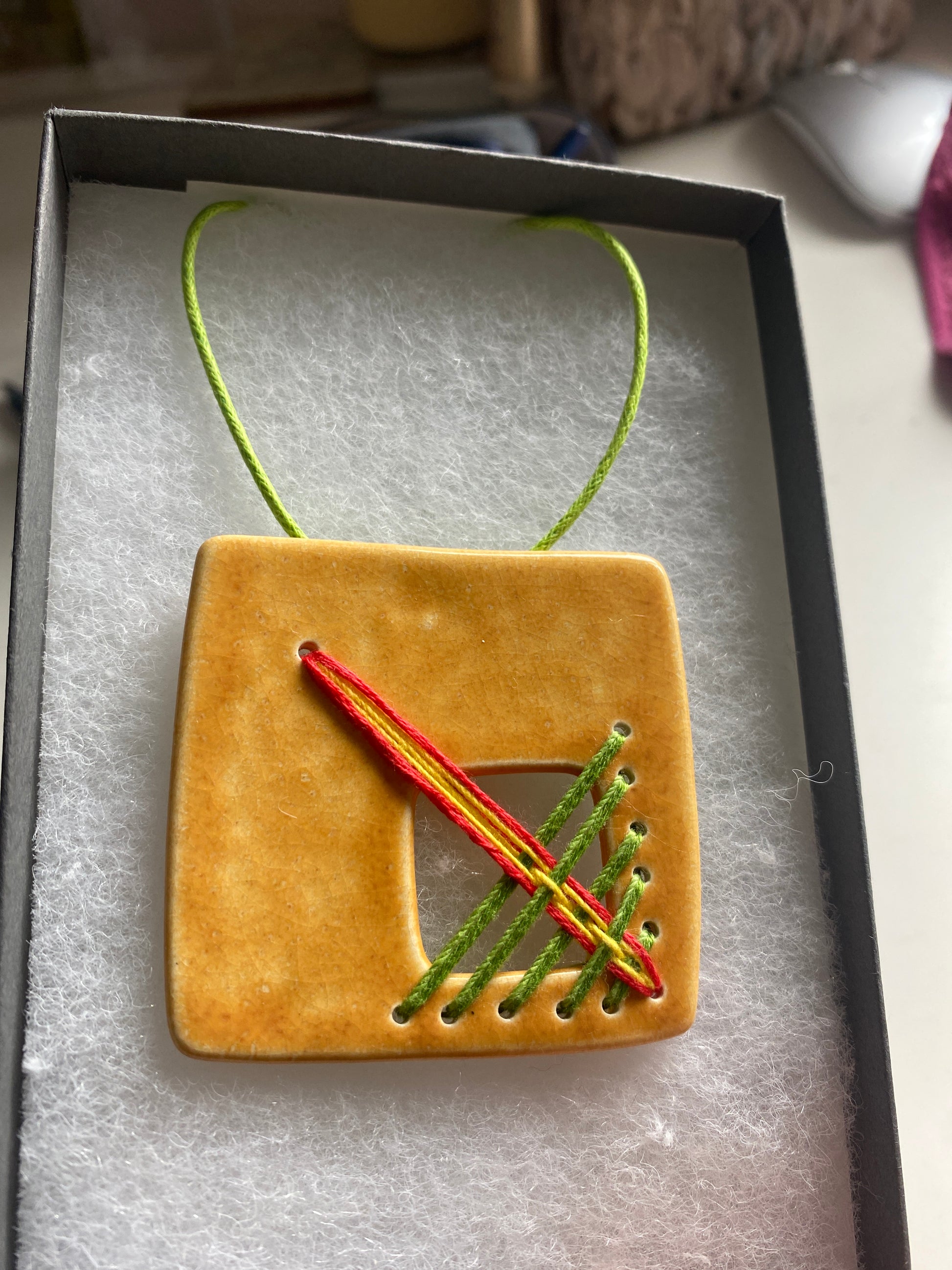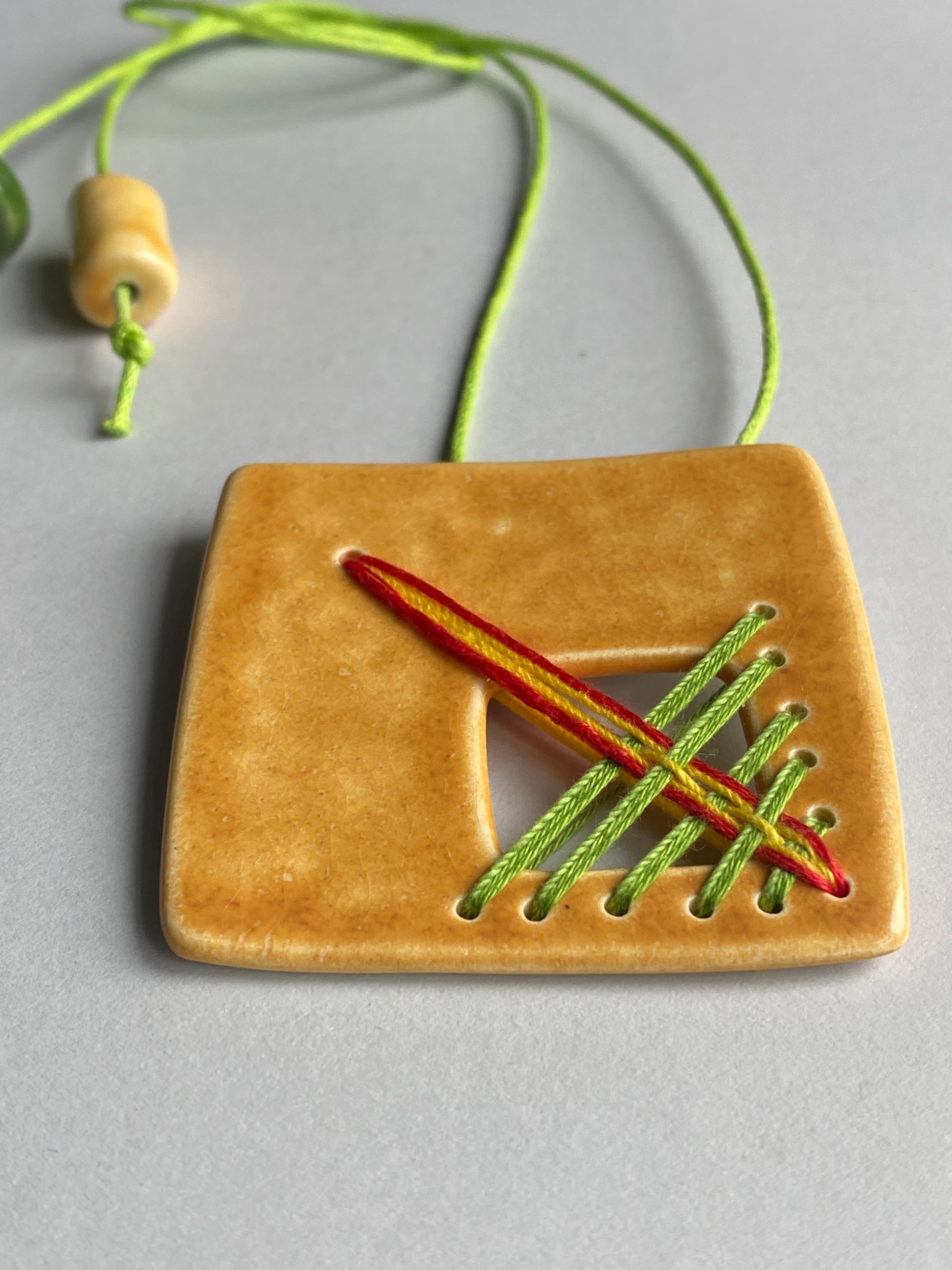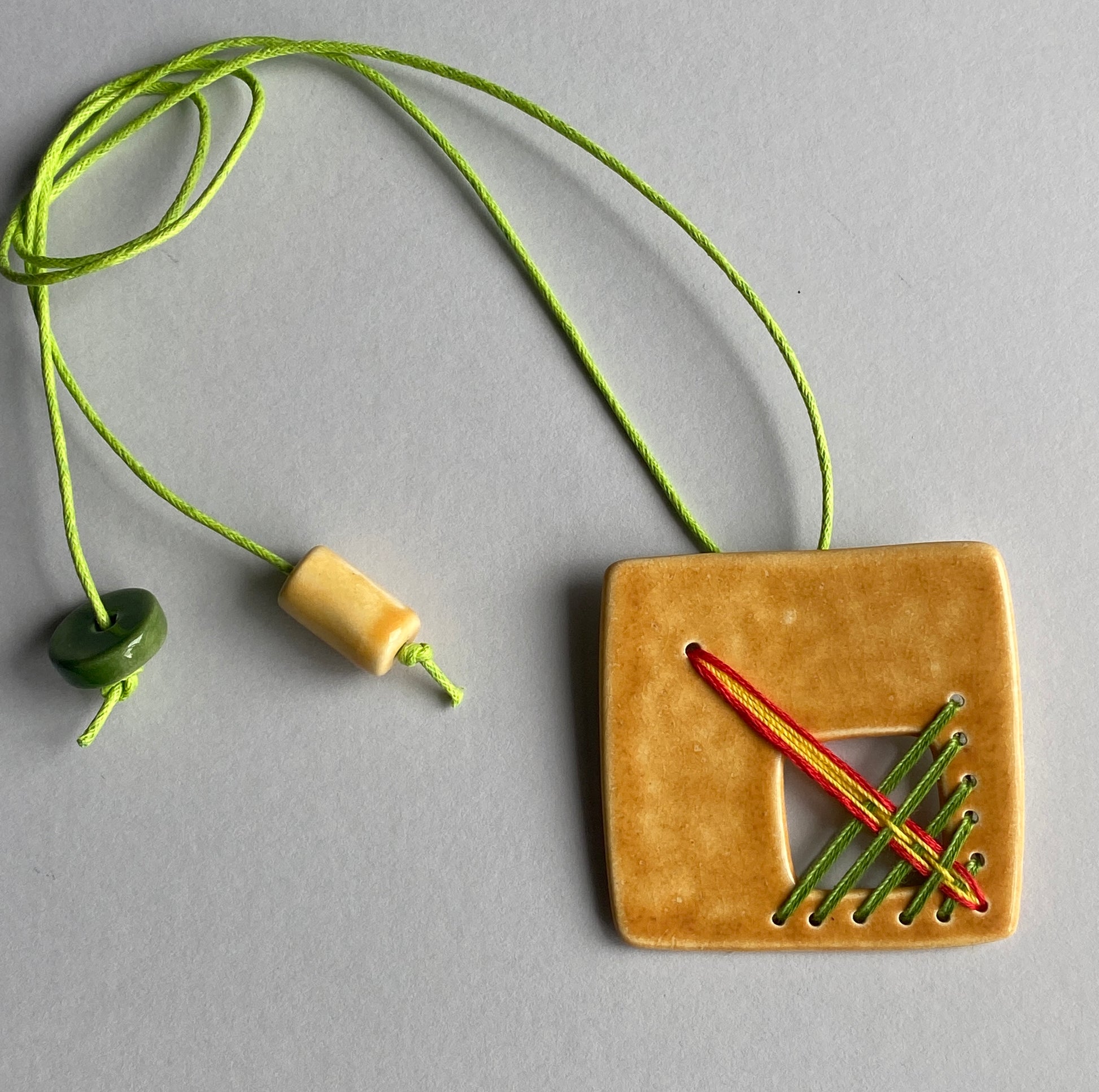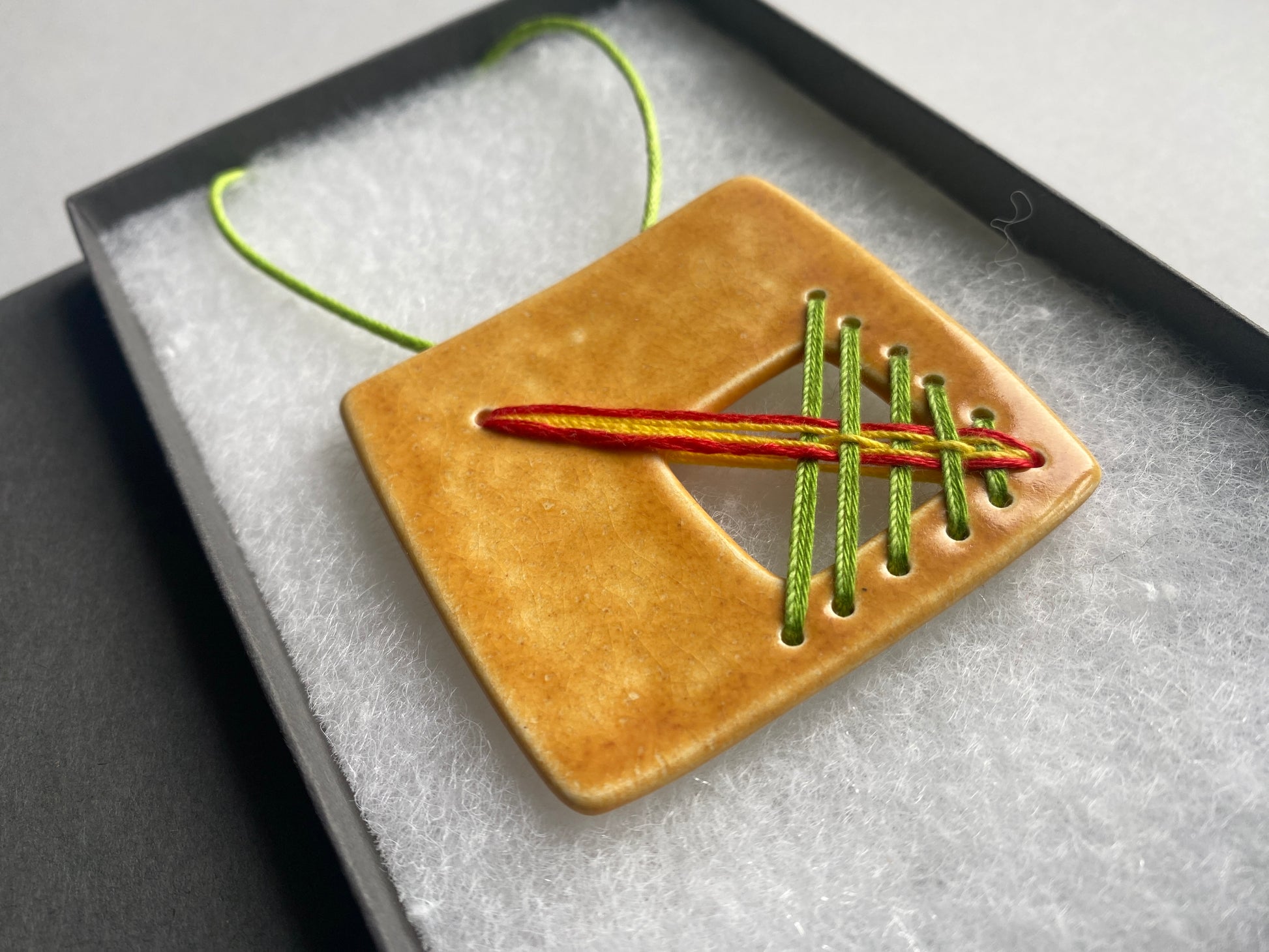 This handmade ceramic pendant necklace is crafted from Earthenware clay and twice fired for strength. Inspired by my childhood, growing up surrounded by a family of sewers, each pendant in this collection brings together my love for stitching and ceramics.