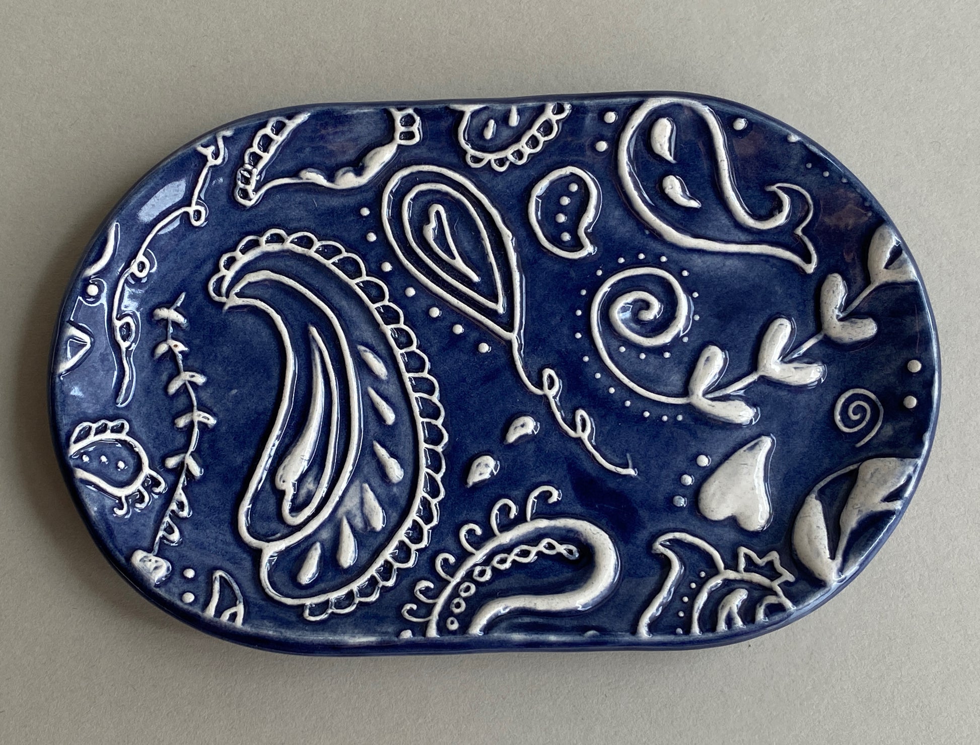 Introducing our versatile Handmade Rectangular Ceramic Trinket Tray, perfect for organising your jewellery or serving as a convenient sewing tray for scissors and needles. These trays are ideal for placement on bedside cabinets, hallways, or near the kitchen sink. Each tray is crafted with care and imprinted with a MatildaBelle original paisley carving, providing a slight raised design for added texture and charm.