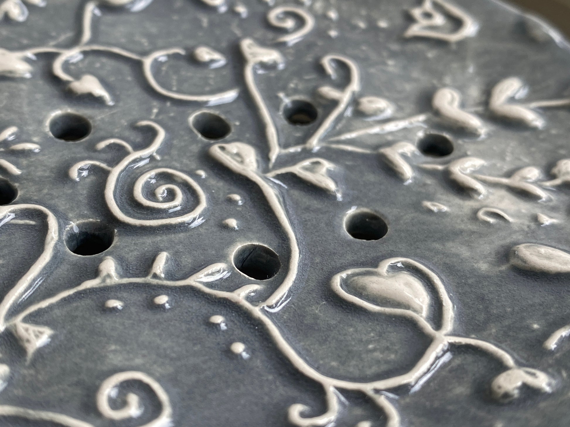 Introducing our exquisite Handmade Oval Ceramic Botanical Soap Dishes, available in a choice of two beautiful finishes. Each dish is imprinted with a whimsical MatildaBelle carving, creating a raised botanical design that is both charming and functional. Choose from a vintage-style cream glaze or a sophisticated grey glaze.