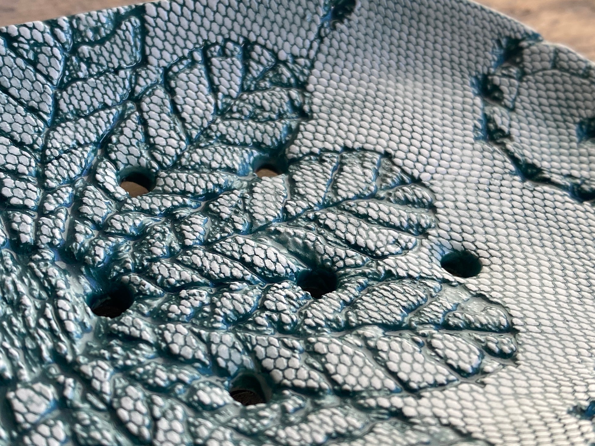 The dish has been imprinted with a beautiful Vintage Crochet Shawl, then glazed in a rich Sea Green before being rubbed back to further reveal the unique pattern.