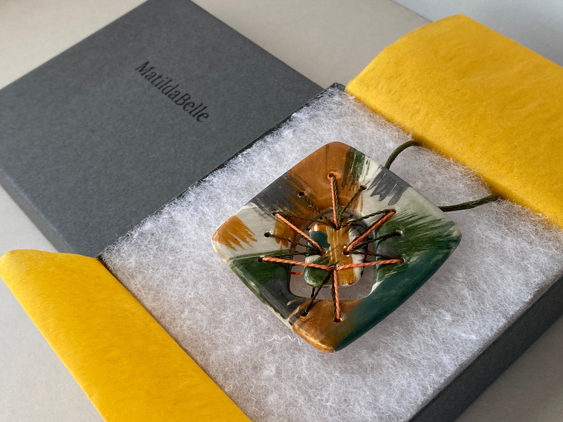 I glaze the pendants in natural tones of green, grey, ochre, black, and teal, which are influenced by the colours I’m surrounded by here in North Yorkshire—from the moors to the dry stone walls.