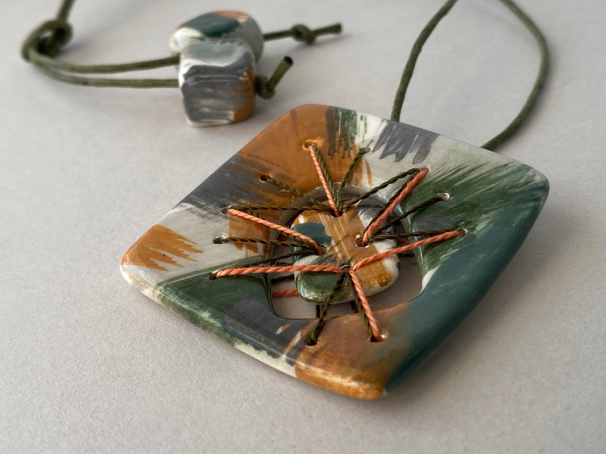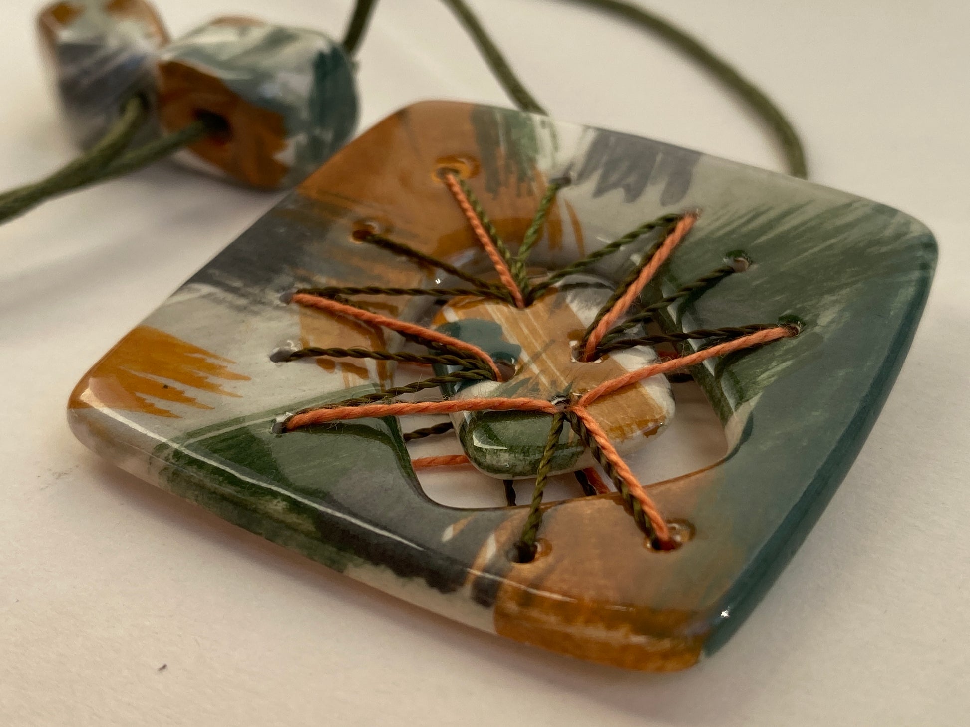 This handmade ceramic pendant necklace is crafted from Earthenware clay and twice fired for strength. Inspired by my childhood, growing up surrounded by a family of sewers, each pendant in this collection brings together my love for stitching and ceramics.