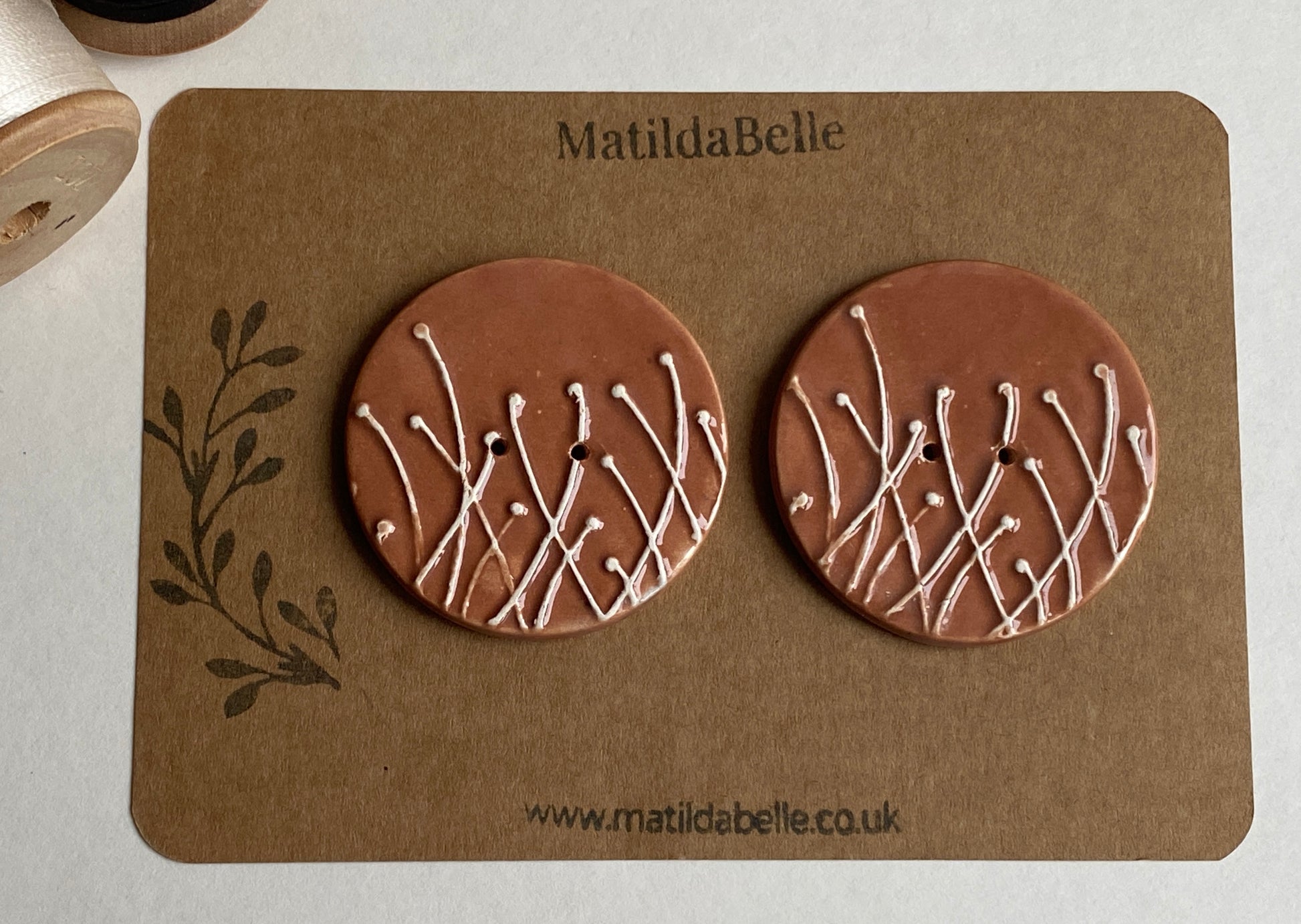 These gorgeously large handmade ceramic round buttons has been imprinted with a MatildaBelle seed head carving inspired by the garden that surrounds her studio. Glazed in a gorgeous Caramel they will suit so many uses.