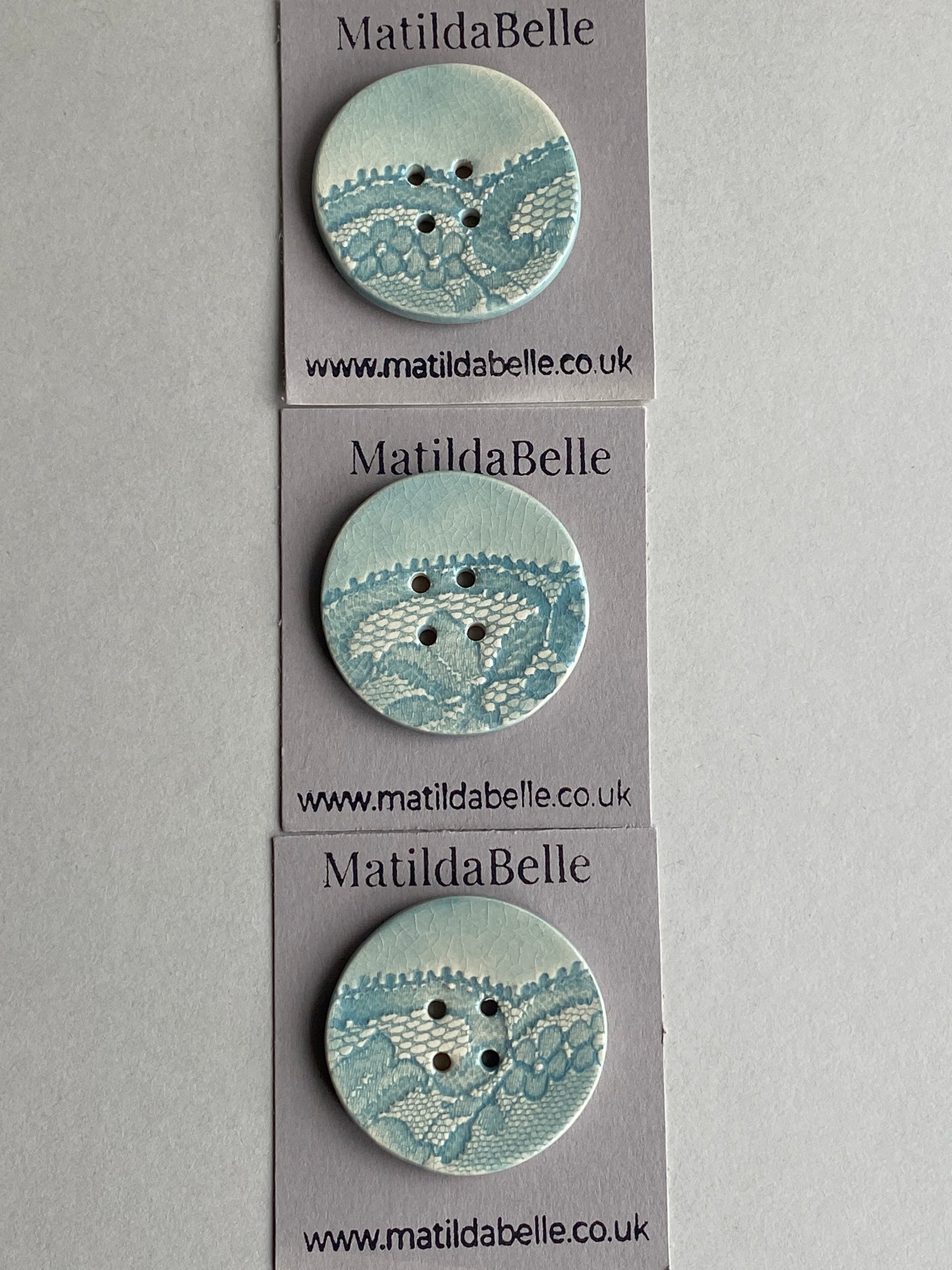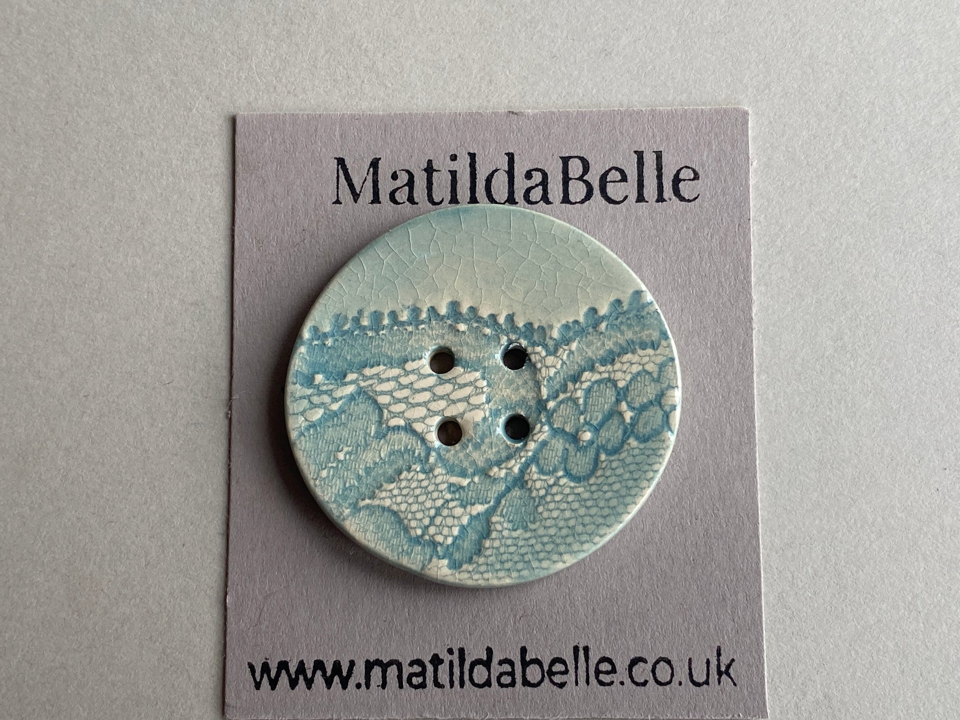 Beautiful Large Ceramic Button printed in Vintage lace each button is sold separately. Glazed in a delicate Sea Green and finished with a glossy transparent Glaze.