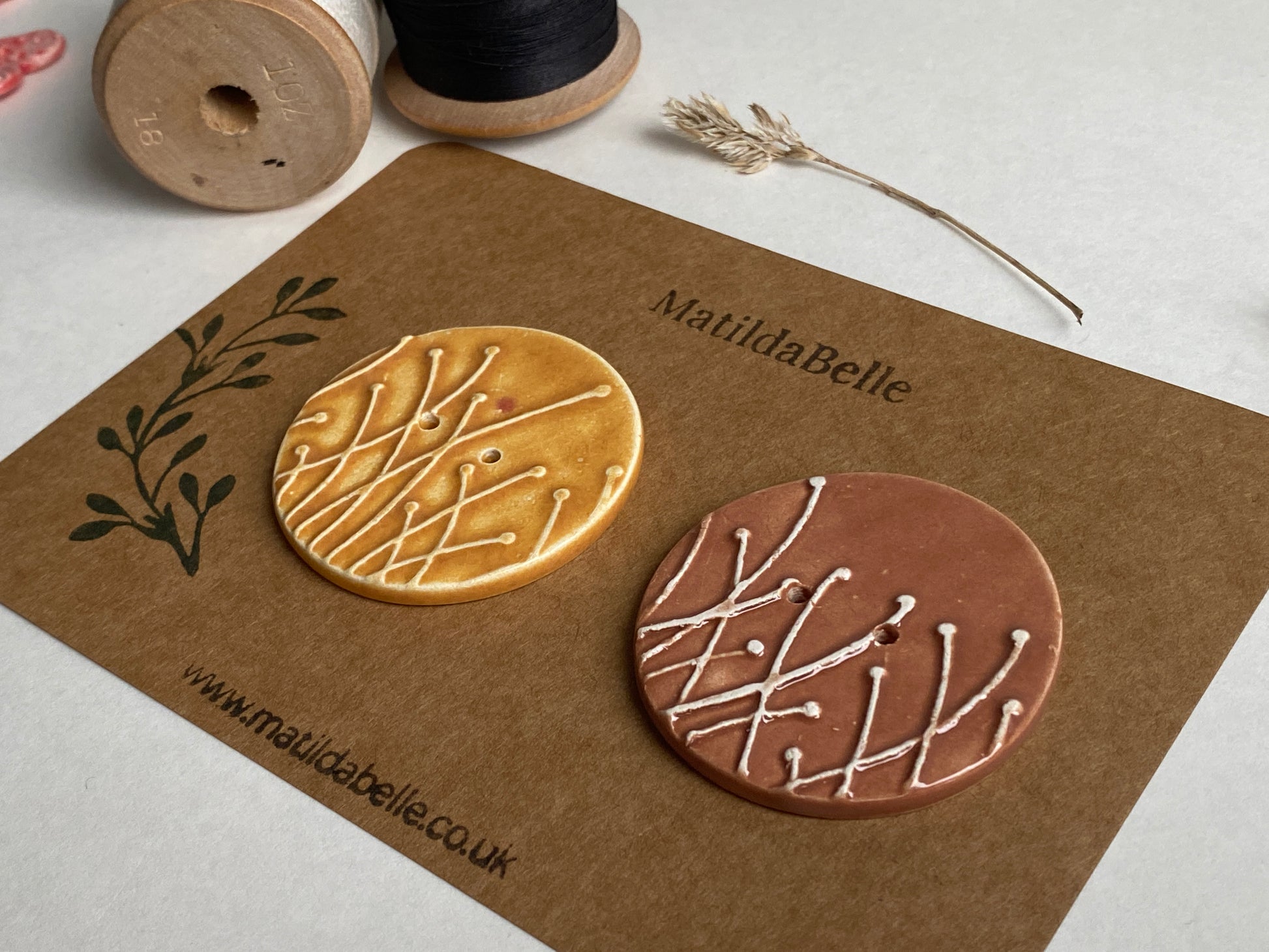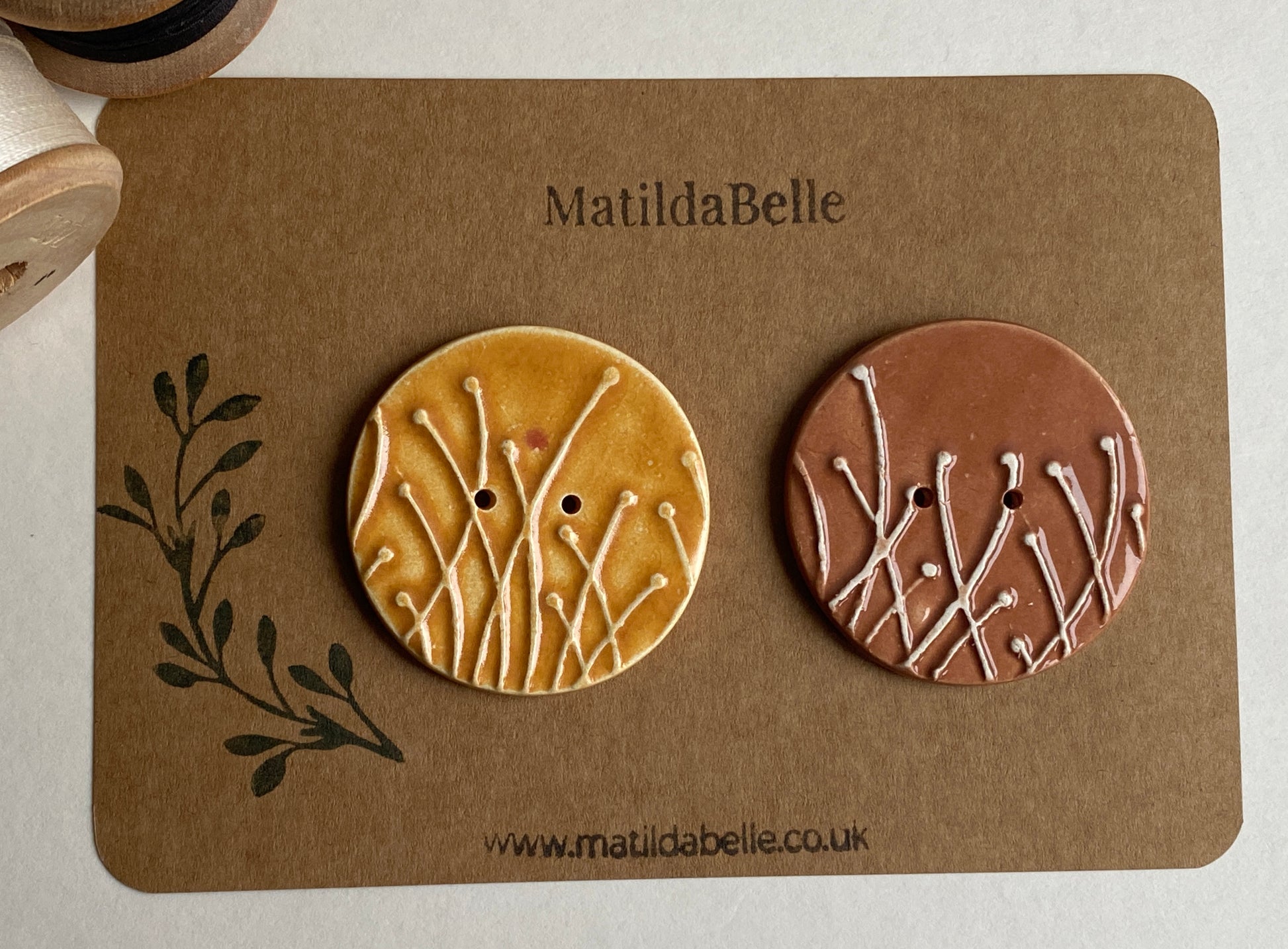 These gorgeously large handmade ceramic round buttons has been imprinted with a MatildaBelle seed head carving inspired by the garden that surrounds her studio. Glazed in gorgeous Honey and caramel they will suit so many uses.