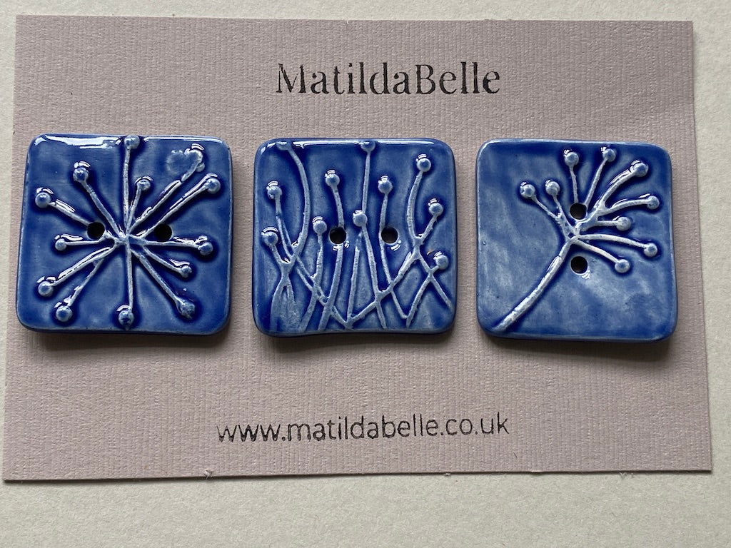 Set of 3 Square Botanical Clay Buttons - 35mm - Blue
