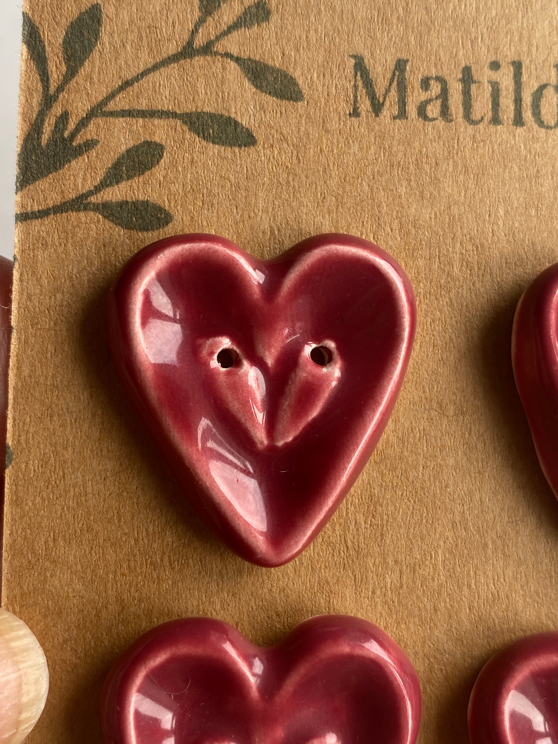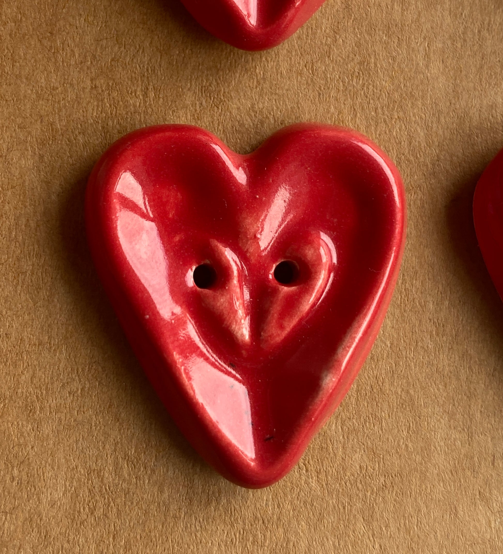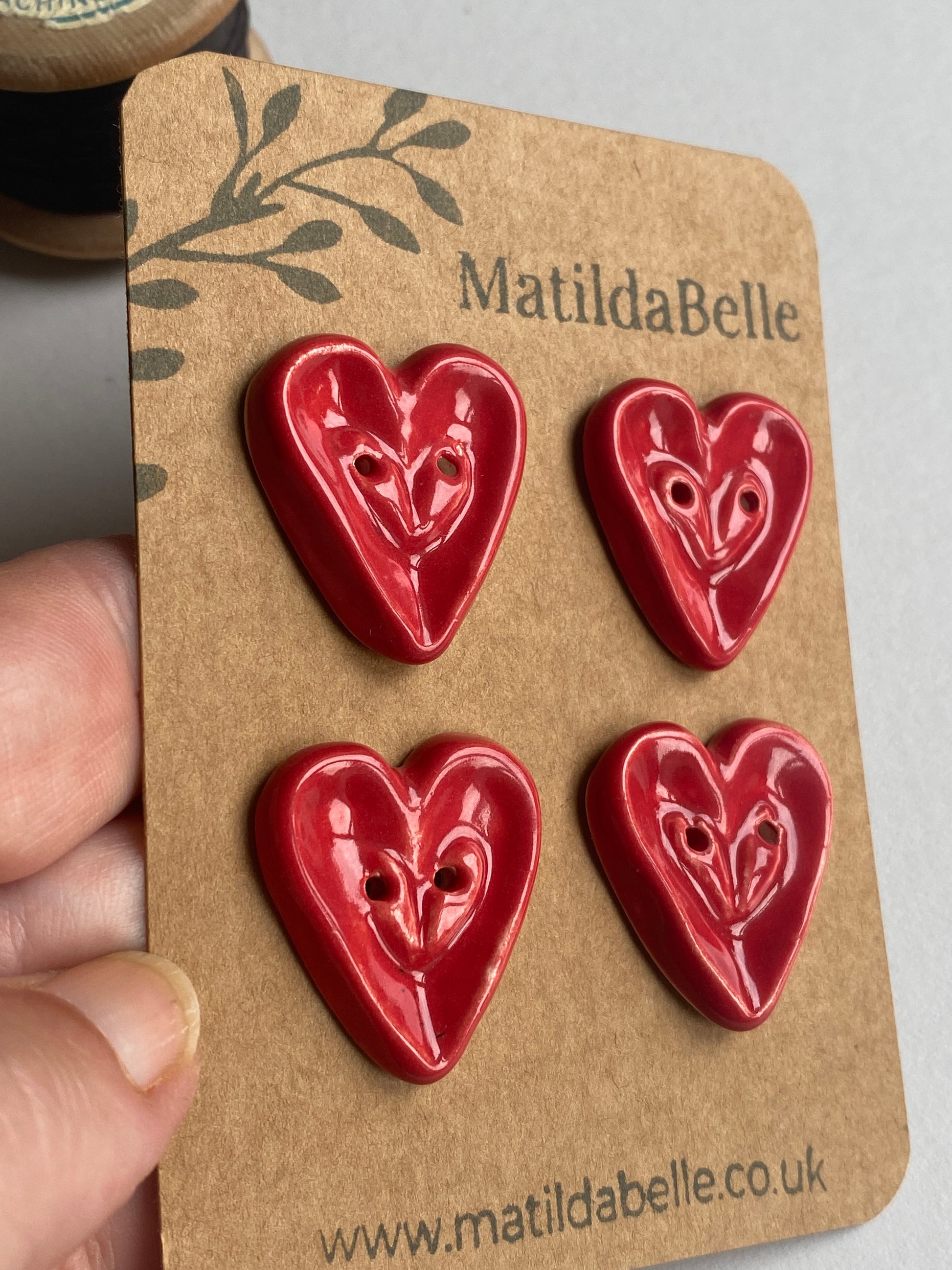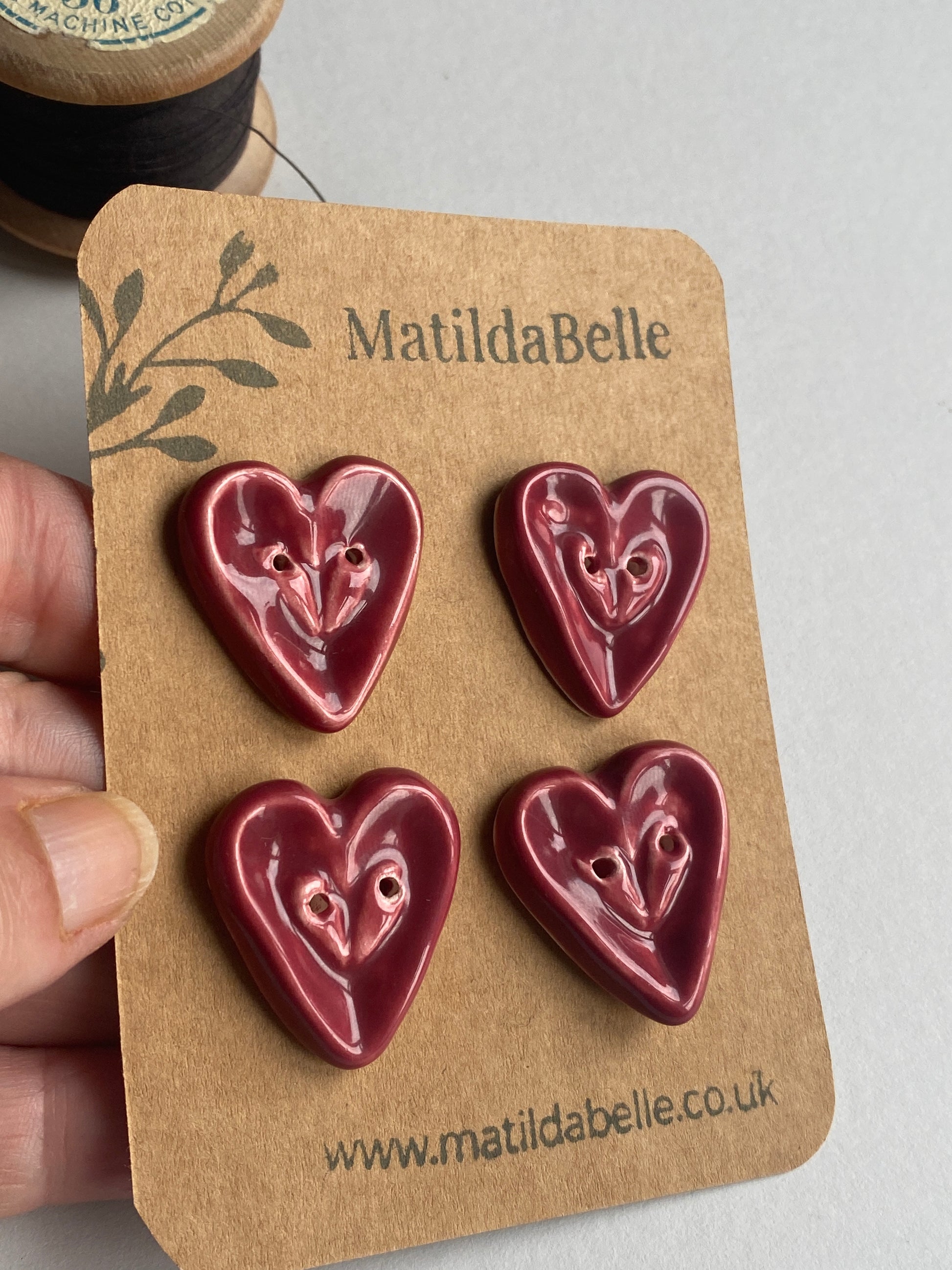 Introducing a set of four press-moulded extra-large heart buttons, each taken from a hand-carved mould and glazed in a choice of True Ted or a rich Wine. These buttons are not only functional but also add a touch of romance and elegance to your sewing and crafting projects.