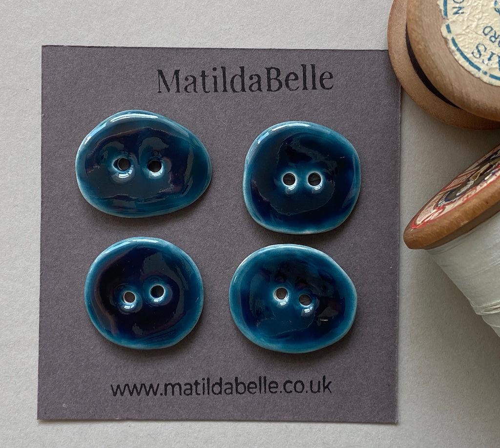 Introducing our newest addition to the collection: a set of four rustic oval buttons crafted from earthenware clay. Each button is glazed to perfection on the front in a stunning petrol blue glossy glaze, while the rear remains unglazed, inviting you to feel the earthy smooth texture of the clay.